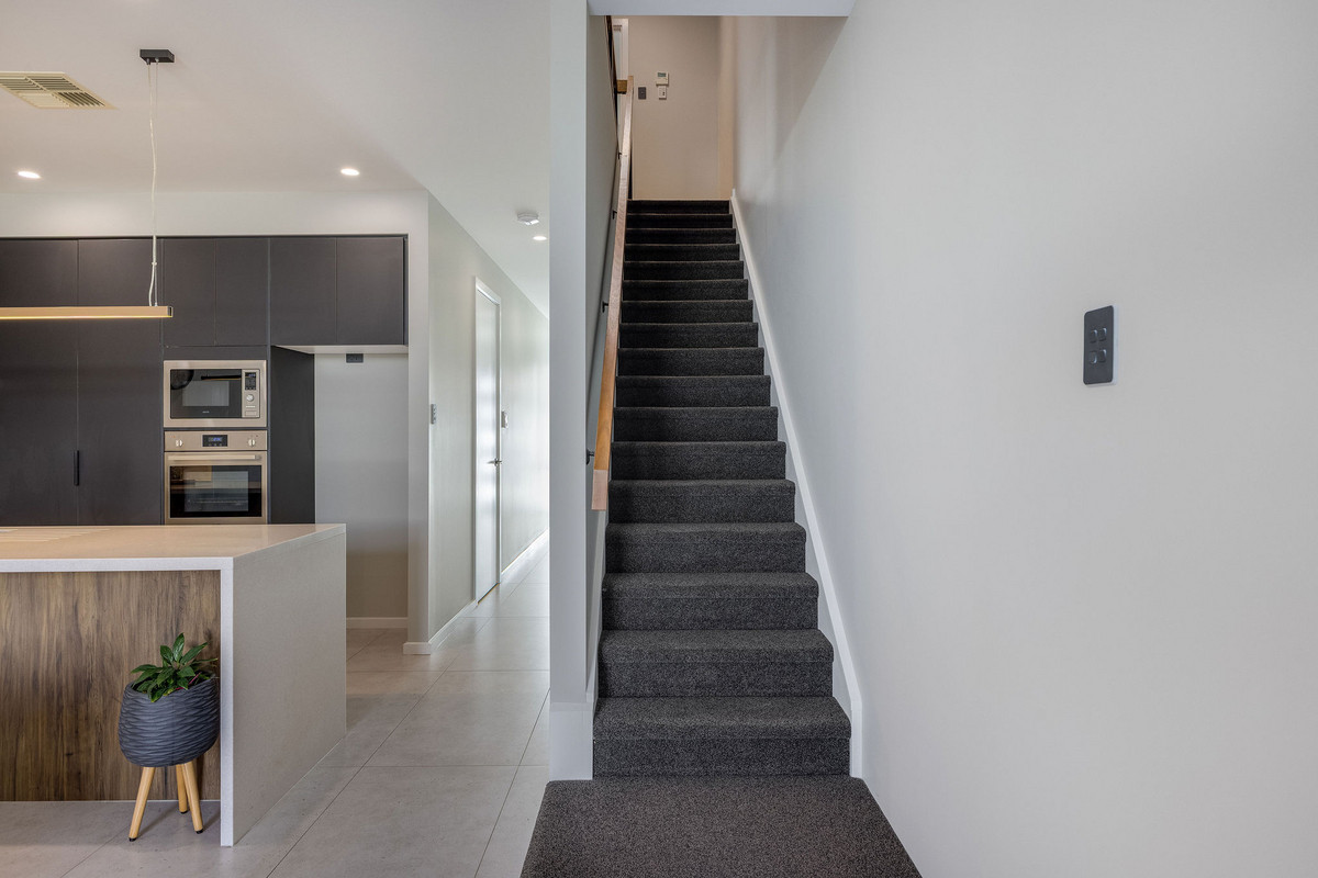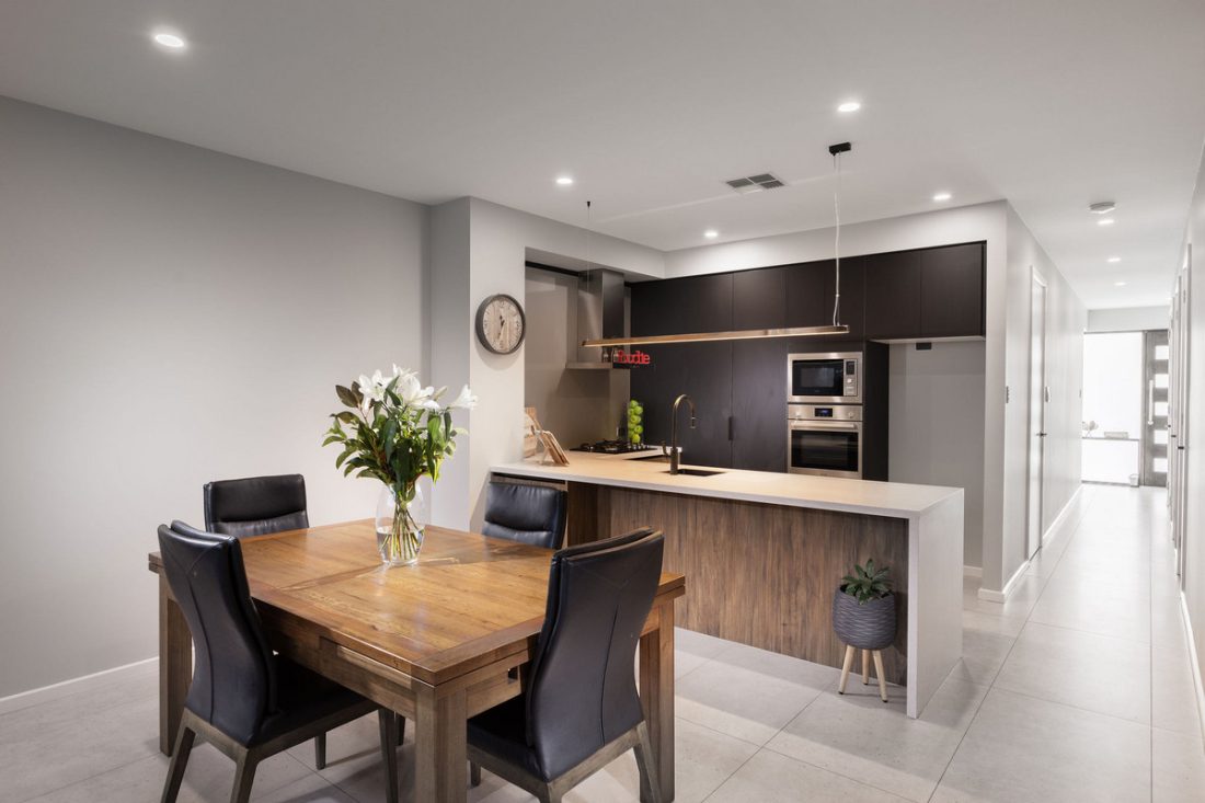 The kitchen exudes both style and functionality, boasting moody two-toned cabinetry, ample bench-space and a sleek undermount sink. Modern stainless-steel appliances, including a gas cooktop, wall oven, and dishwasher, make meal preparation a breeze. The waterfall benchtop extends into a breakfast bar, creating the perfect spot for casual meals and conversation.