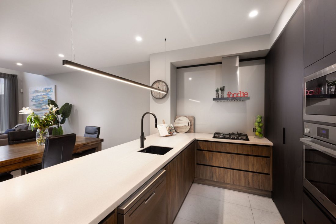 – Contemporary kitchen with moody two-toned cabinetry, bench-top with waterfall edge, under-mounted sink, stainless-steel appliances, and breakfast bar