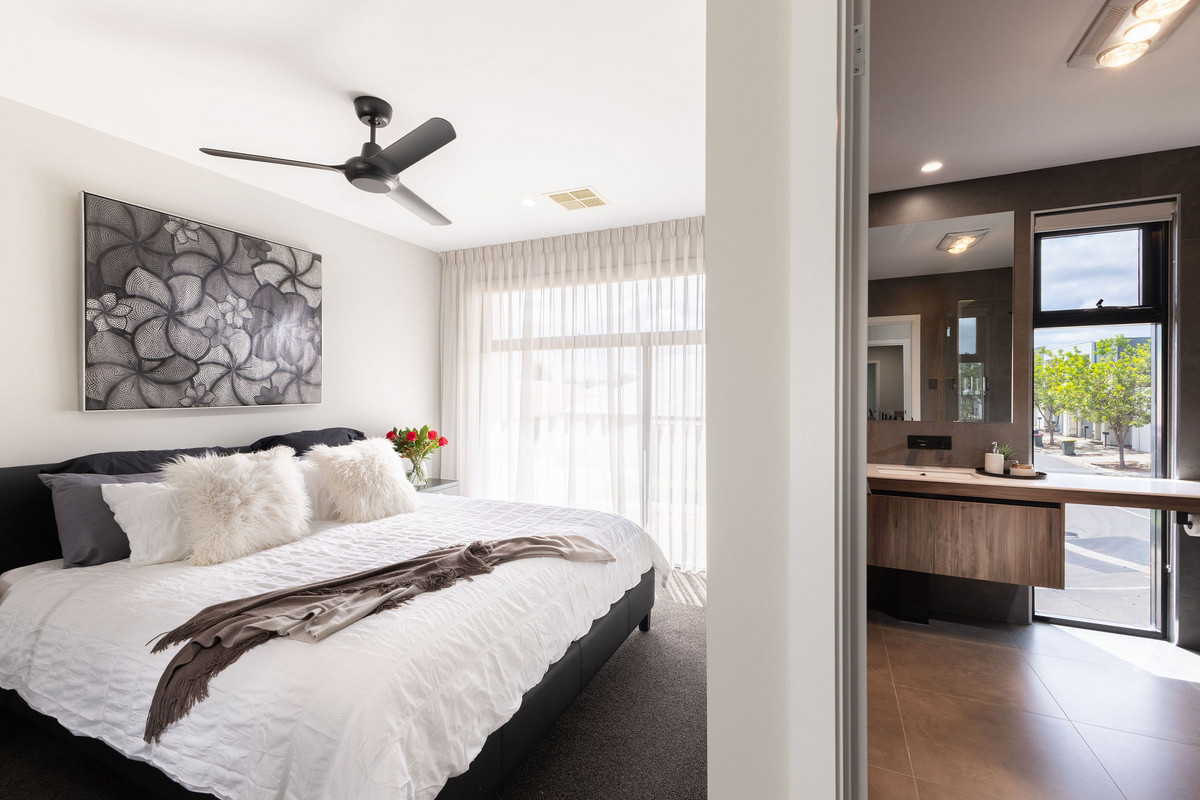 Upstairs, three well-appointed bedrooms offer comfort and style, each featuring plush carpeting, ceiling fans, and built-in robes. The master bedroom enjoys its own private ensuite, while bedrooms two and three share access to a spacious main bathroom. Both bathrooms mirror the same sophisticated finishes, showcasing floor-to-ceiling tiling, a striking chevron-pattern feature wall, wooden-toned vanities, and sleek matte black fixtures.