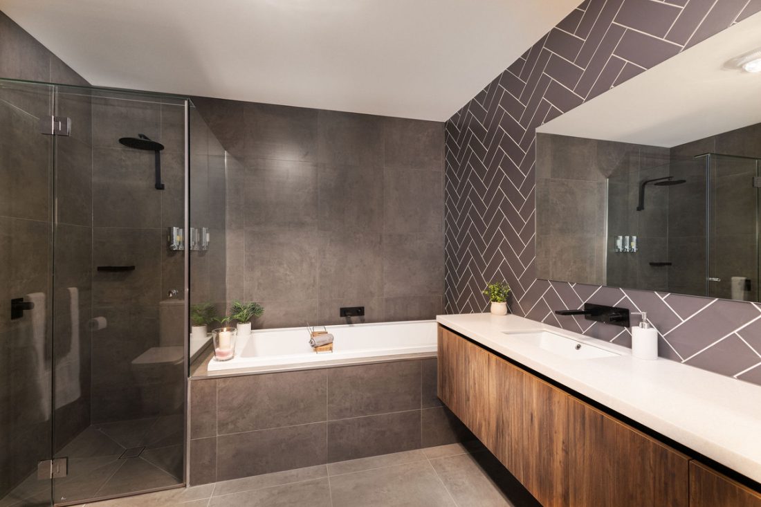 – Both main bathroom and ensuite showcasing floor-to-ceiling tiling, a chevron-pattern feature wall, wooden-toned vanity, and matte black fixtures