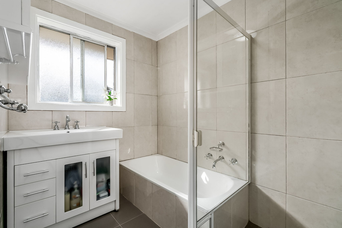 – Renovated main bathroom complete with a modern vanity, floor-to-ceiling tiling and built-in bath