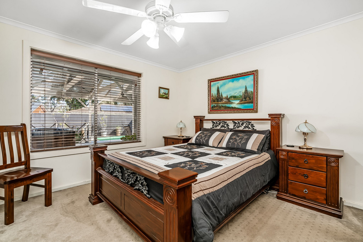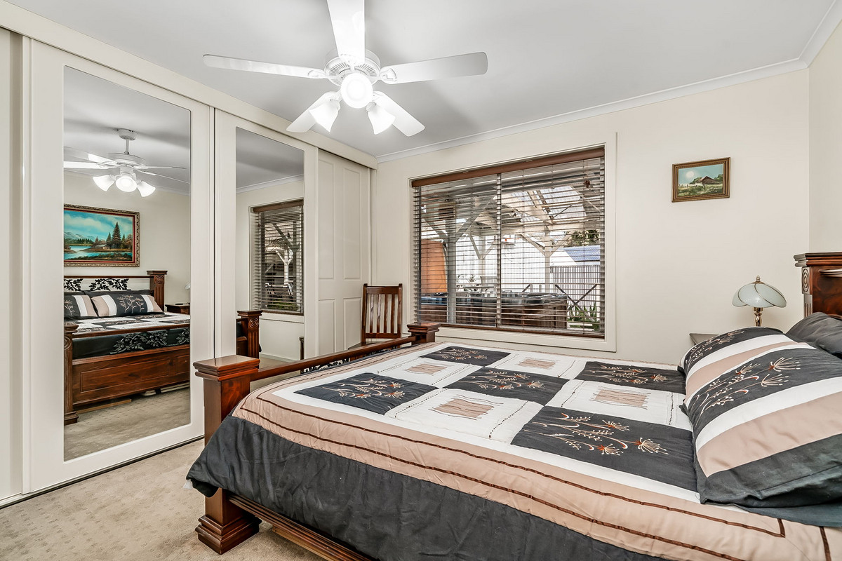 Explore the three well-appointed bedrooms, each adorned with plush carpet and ceiling fans. The master bedroom stands out with built-in storage and an ensuite, forming a private retreat. The main bathroom has been beautifully renovated, featuring floor-to-ceiling tiling, a modern vanity, a built-in bath, and a shower. A separate toilet ensures convenience.