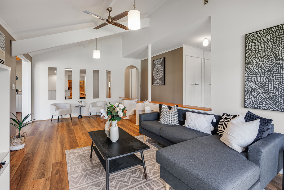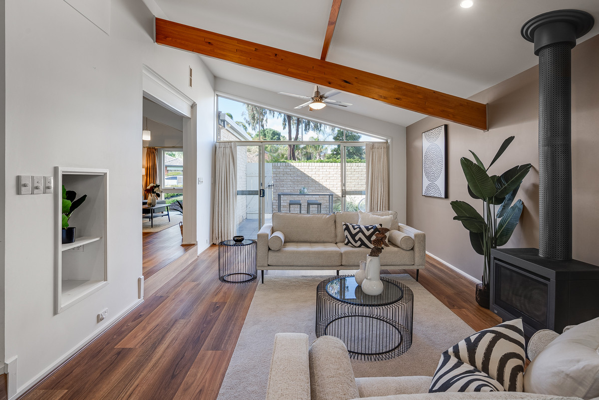 The centralized kitchen serves as the heart of the home, featuring a gas cooktop, ample bench space, and quality appliances, making meal preparation a breeze. The lowered, main living area is bathed in natural light and continues the elegant exposed beams and floating flooring, creating a warm and welcoming atmosphere for gatherings and everyday living.