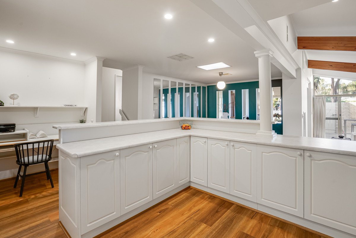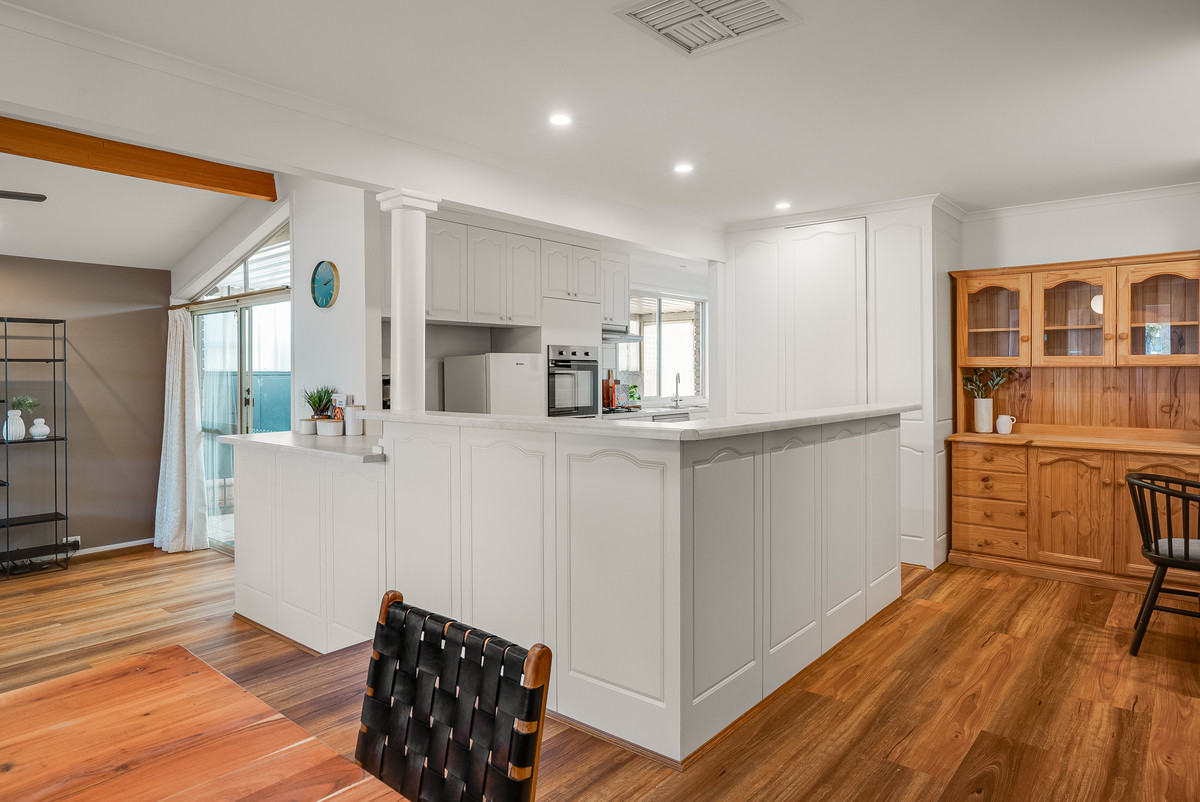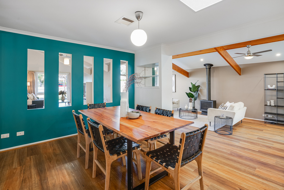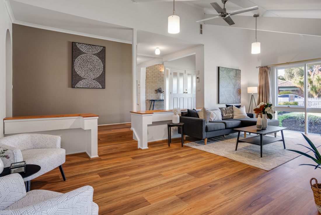 As you step inside, you’ll be greeted by a radiant timber-look floating flooring that flows seamlessly throughout the home. The large front lounge room, adorned with exposed beams offers a versatile space that can be tailored to your preferences – a games room, teenage retreat, or a cozy spot for family movie nights.