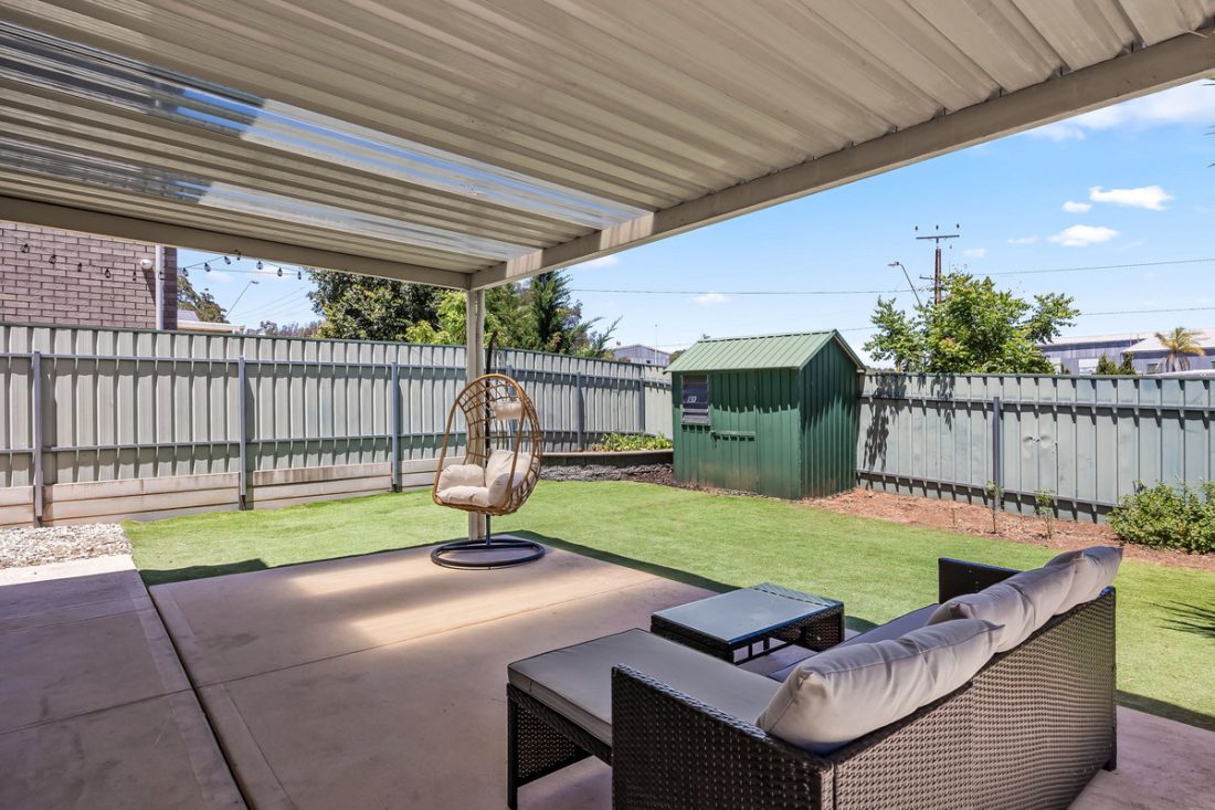 – Paved verandah overlooking artificial turf, shed and rainwater tank