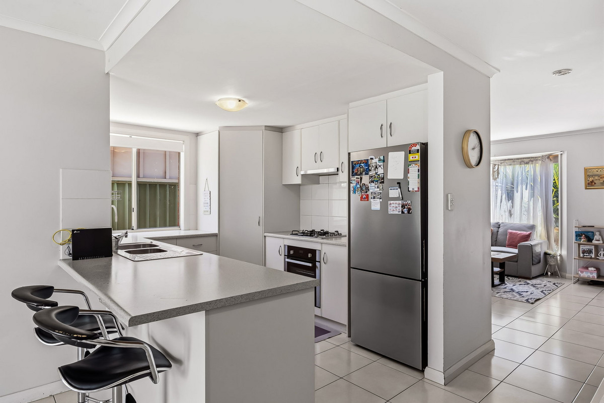 Moving through to the rear, the kitchen overlooks the meals area, creating a connected hub for daily living. Stainless steel appliances, including a gas cooktop, oven and dishwasher, pair with a double sink and ample cabinetry to deliver both style and functionality. A wraparound breakfast bench offers the flexibility of casual bar seating, perfect for morning coffees or easy weeknight dinners. Glass sliding doors extend the space outdoors to a paved verandah, overlooking artificial turf, established greenery, a garden shed and rainwater tank. It’s a backyard with room to personalise and make your own.
