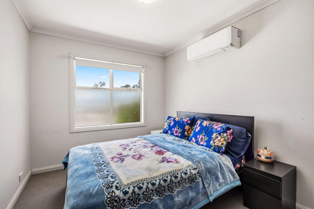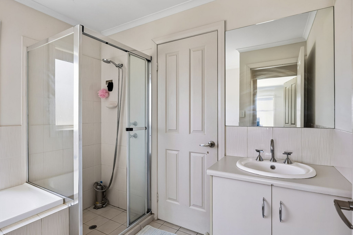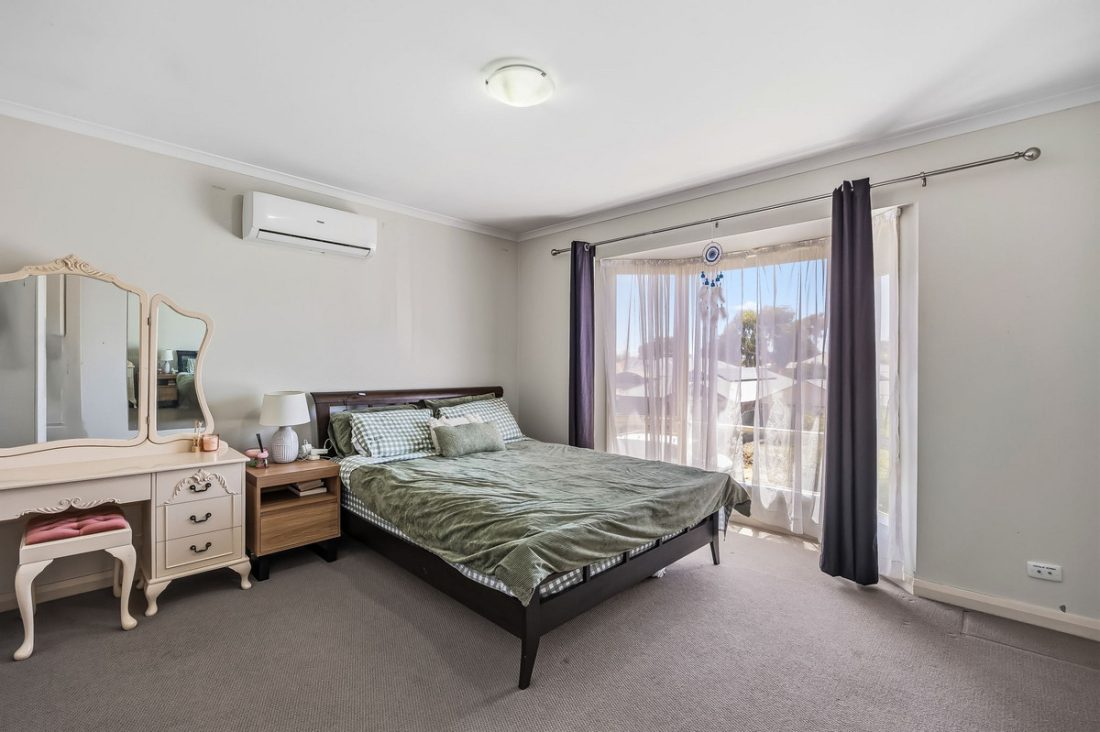 Upstairs, fully carpeted for warmth and comfort, you’ll find all three bedrooms thoughtfully positioned for privacy. The main bedroom enjoys its own bay window, walk-in robe and split system air conditioning, creating a comfortable retreat. The two-way main bathroom, accessible from the master, features a bathtub, shower and vanity. The remaining two bedrooms are also fitted with split system air conditioning, ensuring the entire upper level feels comfortable year-round.