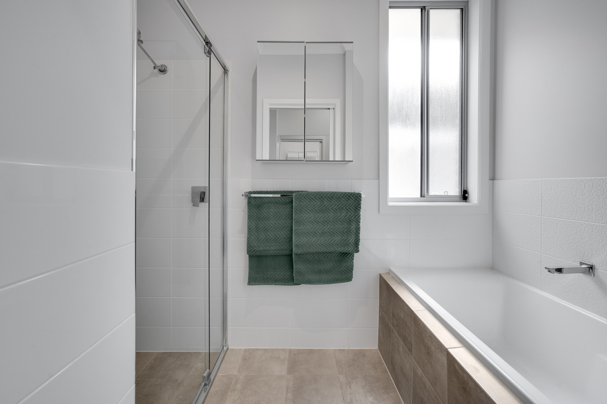 The master bedroom also enjoys a stylish ensuite bathroom, showcasing a double vanity, double shower, high-quality fixtures and beautifully tiled walls. The main bathroom mirrors these impeccable finishes, with a built-in bath, spacious shower and seperate toilet.