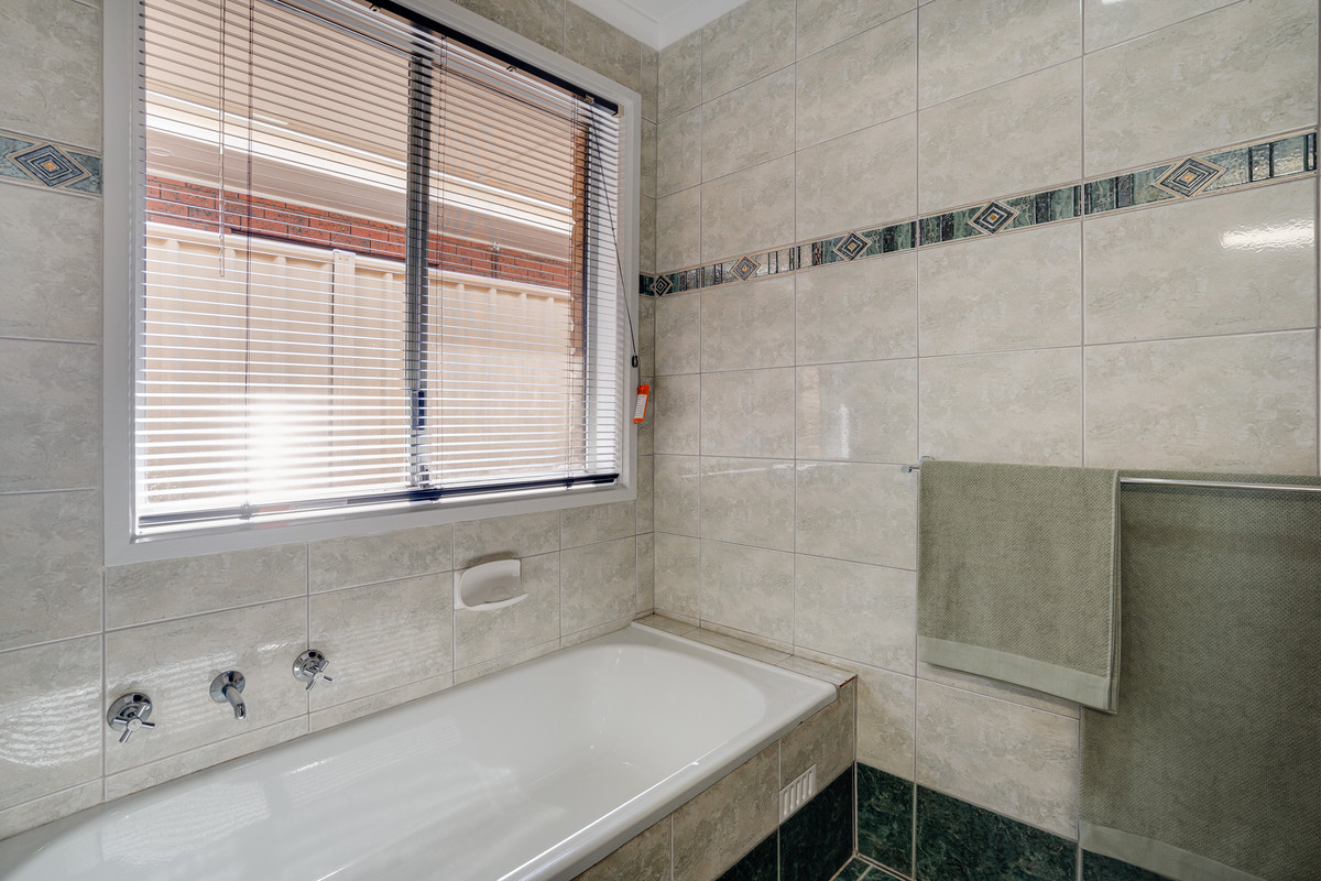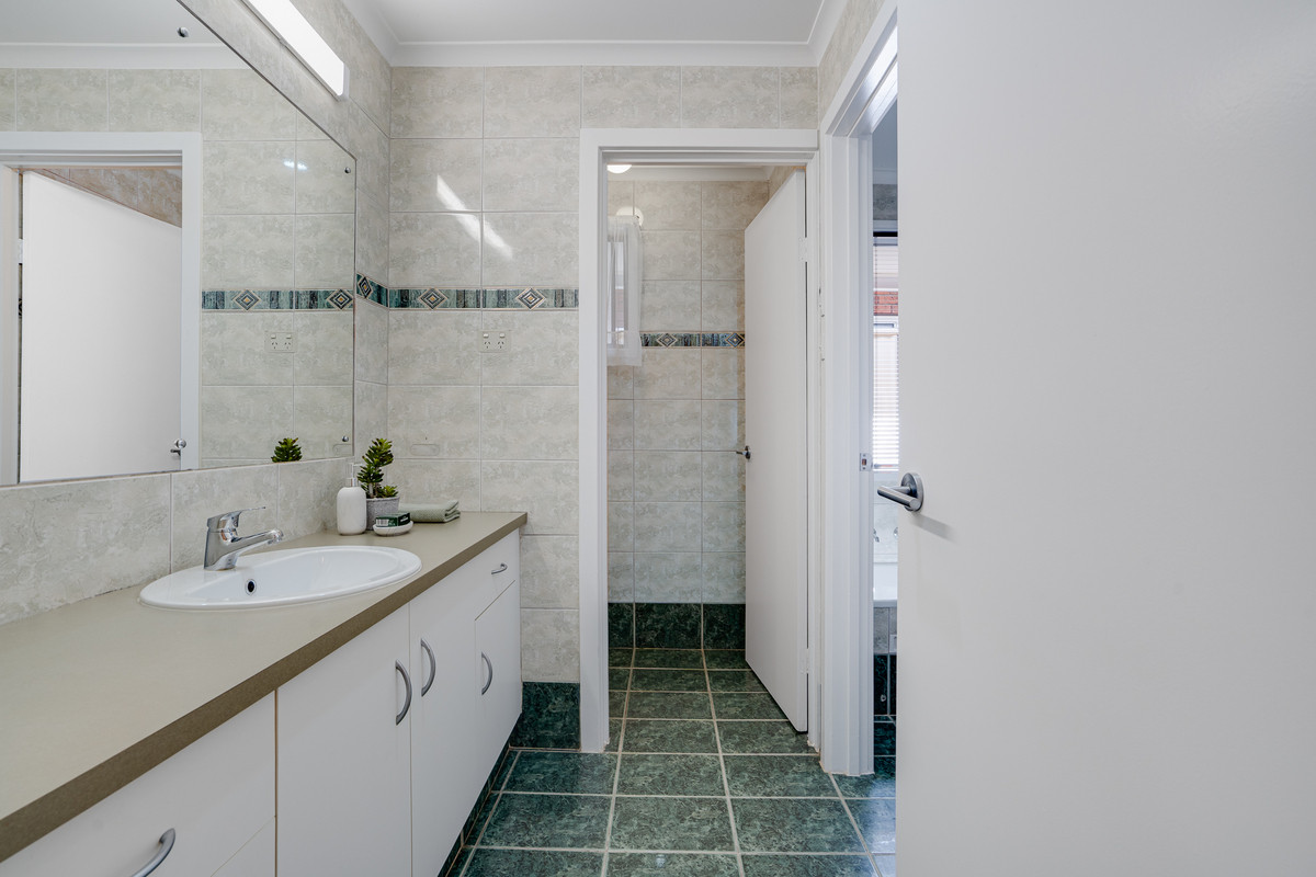 Discover two more bedrooms at the rear of the home, both well sized and featuring built in robes. The main bathroom serves these bedrooms and features a 3-way layout with a separate washroom and water closet. Floor-to-ceiling tiling, modern fixtures, and plenty of storage complete this space.