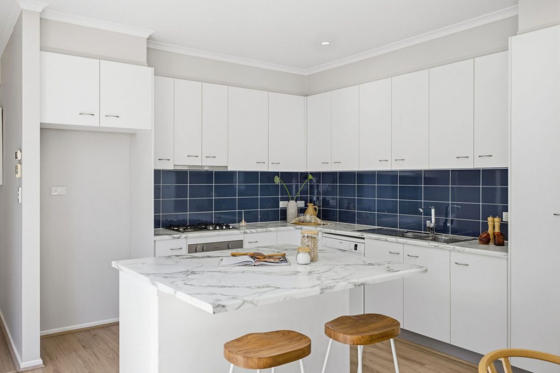— Stylish kitchen with island bench, navy splashback and stainless steel appliances
