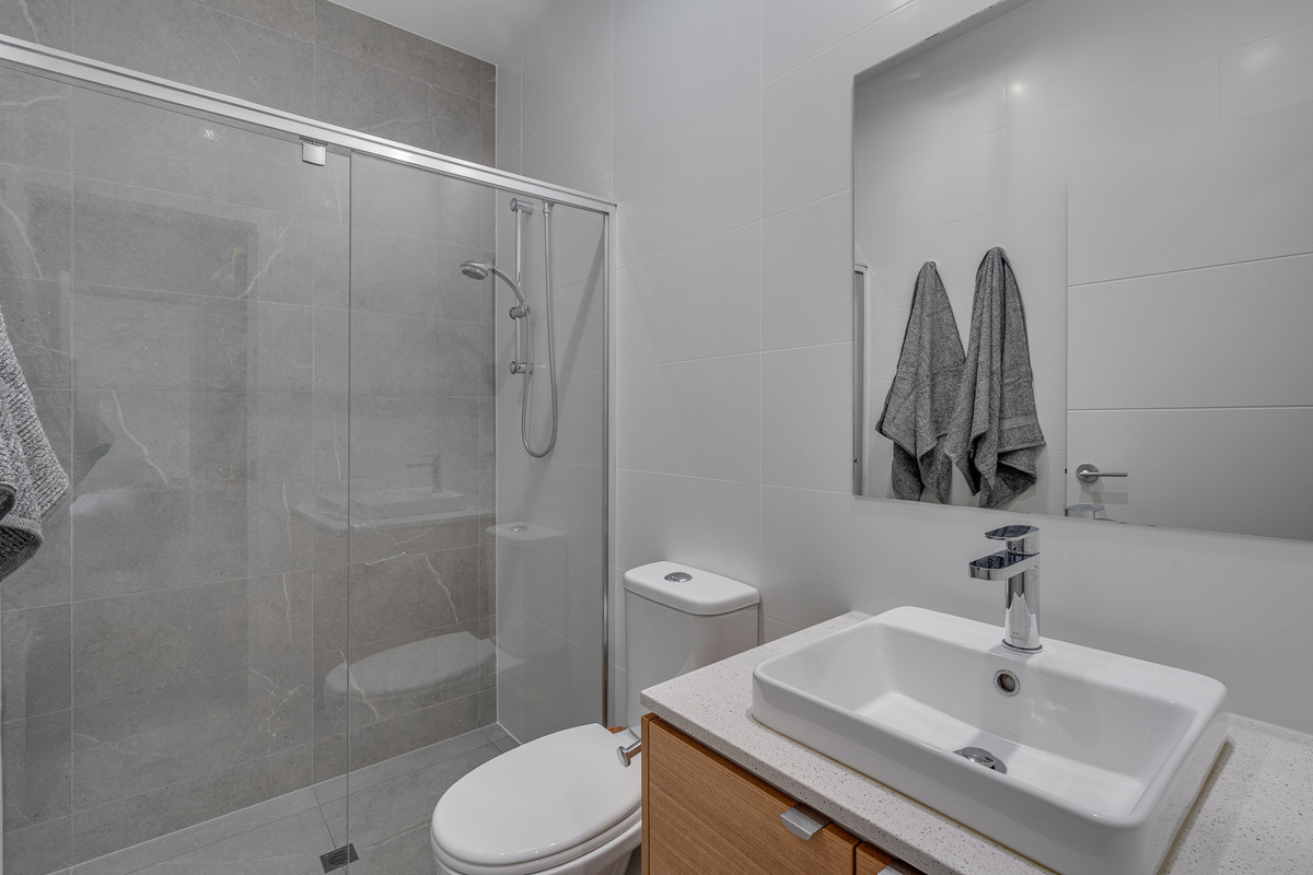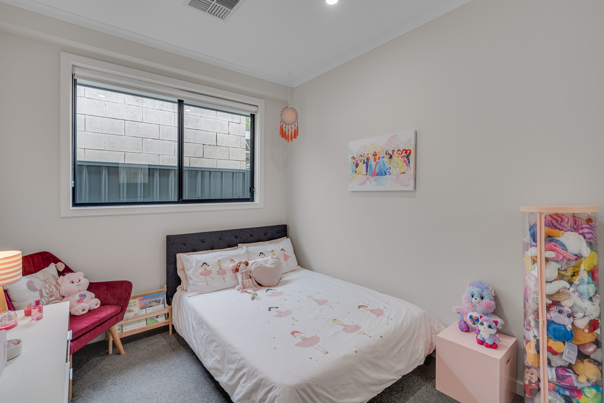 All three bedrooms are purposefully laid out, each featuring plush carpet underfoot, built-in storage and large windows fitted with blinds to let the natural light pour in. The master bedroom boasts a walk-in robe and private ensuite with floor-to-ceiling tiling, while the central main bathroom is just as impressive—complete with a built-in bath, generous storage, and sleek finishes.