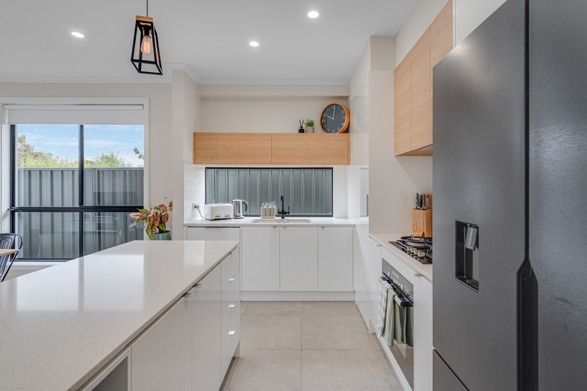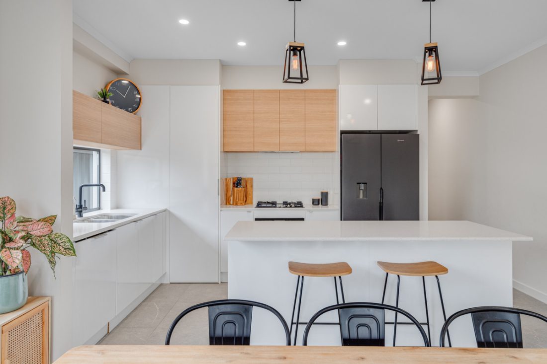 At the heart of the home is a bright and modern kitchen showcasing a stunning island bench with breakfast bar, white and light timber-toned cabinetry, gas cooktop, hidden dishwasher, and space for a double fridge—perfectly paired with the open-plan living and dining area. This light-filled zone opens seamlessly to the outdoors, creating an effortless flow for entertaining or simply relaxing at home.