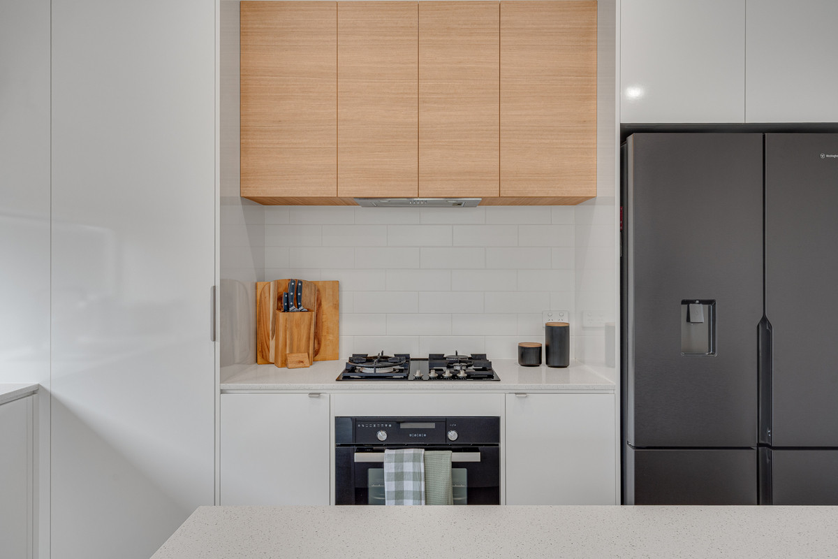 – Kitchen with island bench, gas cooktop, hidden dishwasher, and double fridge space
