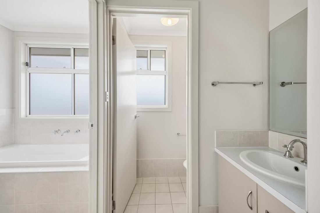 Upstairs, a bright landing offers flexibility as a compact second living area or study space. Two further bedrooms, both with built-in robes, are serviced by a cleverly designed three-part bathroom with a full bathtub and shower, a separate vanity area and a separate wash closet which is ideal for busy households.