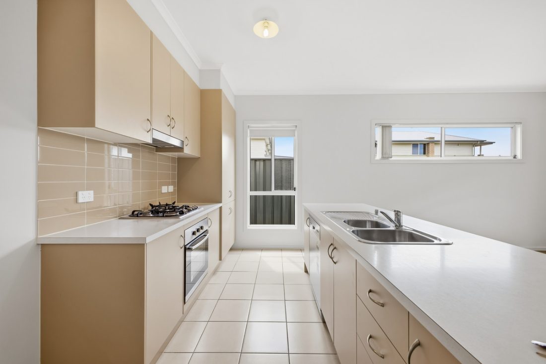 Step inside and you’re greeted by a plush, carpeted formal living room to the right, setting the tone for a calm and comfortable home. Follow the hallway through to the open plan kitchen, dining and living zone which instantly feels welcoming. The kitchen brings style and practicality together with tonal cabinetry, an island bench with breakfast seating, gas cooktop, stainless steel appliances, dishwasher, double sink and a crisp tiled splashback.