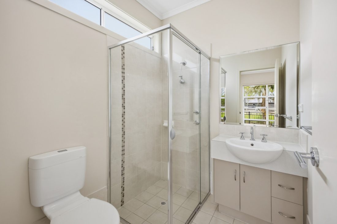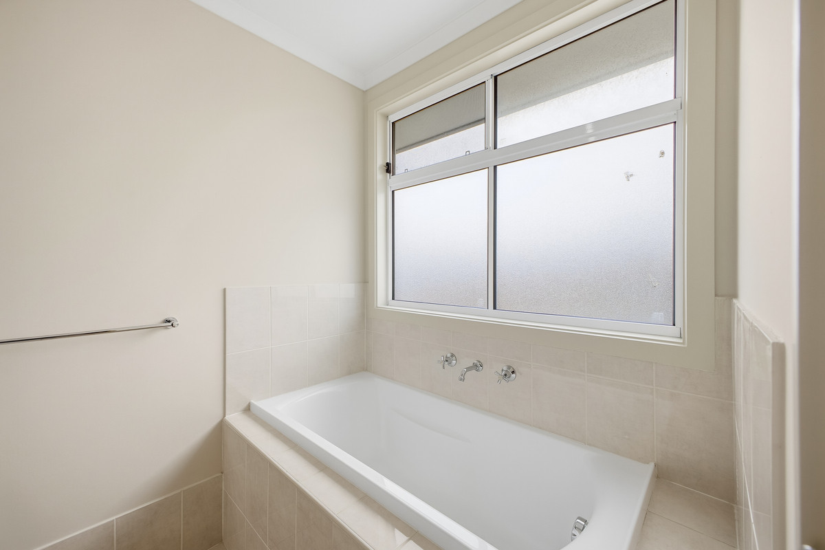 Upstairs, a bright landing offers flexibility as a compact second living area or study space. Two further bedrooms, both with built-in robes, are serviced by a cleverly designed three-part bathroom with a full bathtub and shower, a separate vanity area and a separate wash closet which is ideal for busy households.