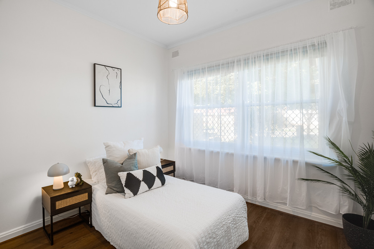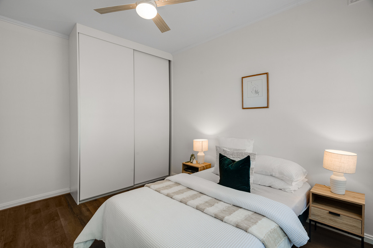 The master bedroom complete with a built-in robe, ceiling fan, and a wide window that invites soothing natural light. Continuing the theme of comfort, two additional bedrooms adorned with oak-look flooring provide generous space and abundant natural light. The second bedroom is also equipped with a ceiling fan, enhancing year-round comfort.