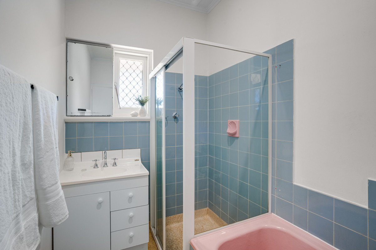 The original-look main bathroom with terrazzo flooring is strategically positioned in the middle of the home, caters to the privacies of a growing family. Complete with a shower and built-in bath, it’s a functional space that meets practical needs. An additional separate WC adds convenience for various living arrangements.