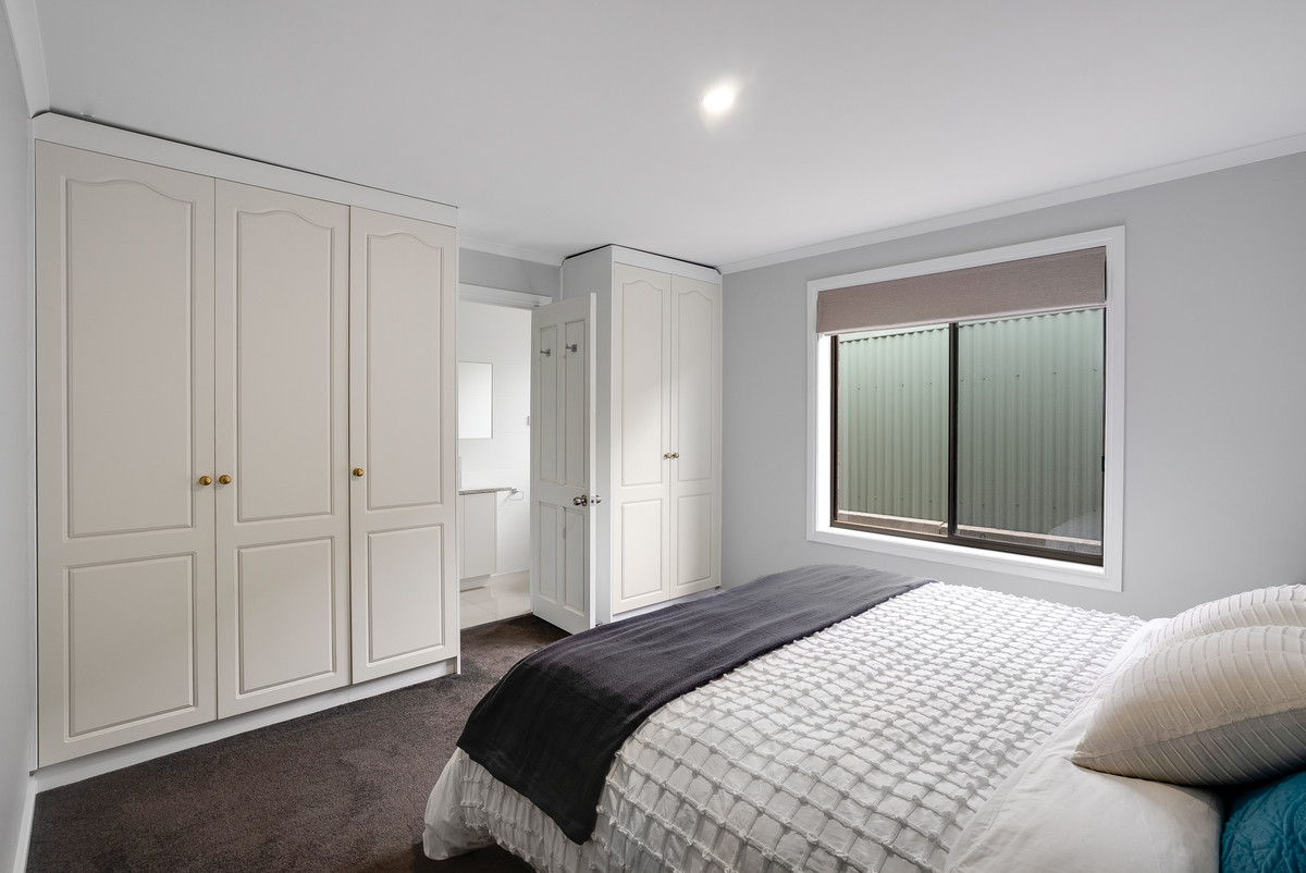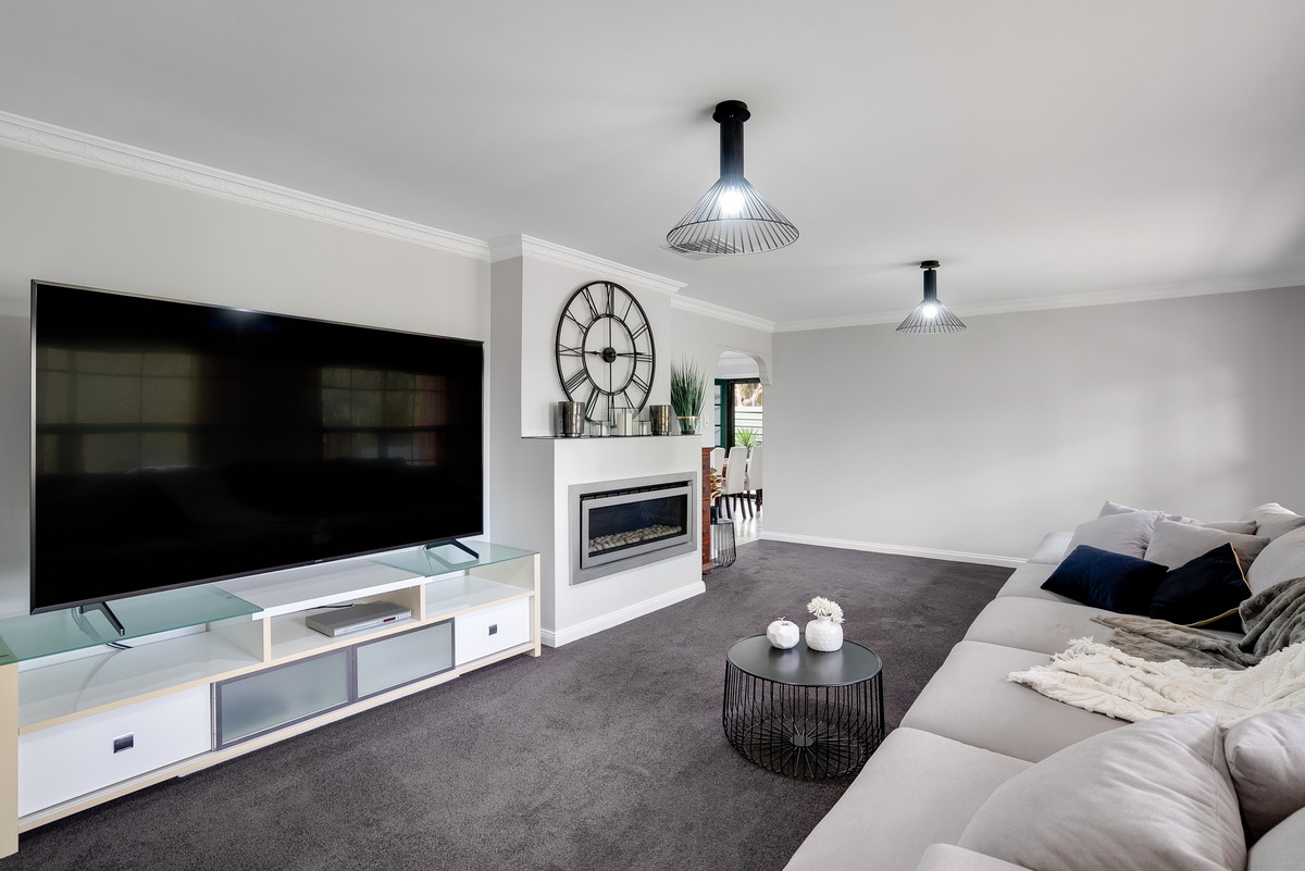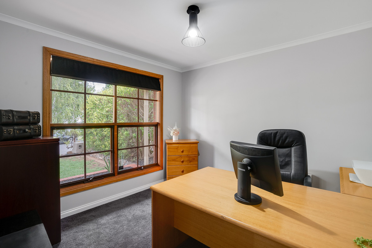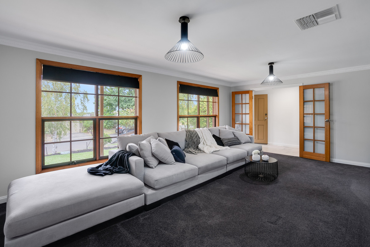 The master suite is a retreat in itself, boasting large built-in robes and private ensuite, while three additional bedrooms offer plush carpeting and built-in robes. An optional 5th bedroom, home office, or kids’ playroom provides flexibility to suit your lifestyle needs. Elegantly updated, the main bathroom features modern floor-to-ceiling tiling, a built-in bath, and chrome tap ware, while a separate WC adds convenience and privacy for guests.