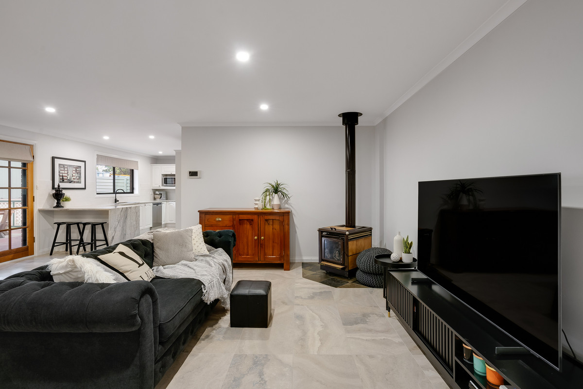 The heart of the home lies in its large centralized kitchen, complete with modern tiled flooring, a gas cooktop, Bosch appliances including two ovens, and a stunning waterfall benchtop/breakfast bar area. Adjoining the kitchen is a formal dining area, seamlessly connecting indoor and outdoor living through double French doors. A second main family room serves as the hub of the home, featuring tiled flooring, a wood fireplace, and easy access to the expansive outdoor area, making it an ideal space for both relaxation and entertaining.