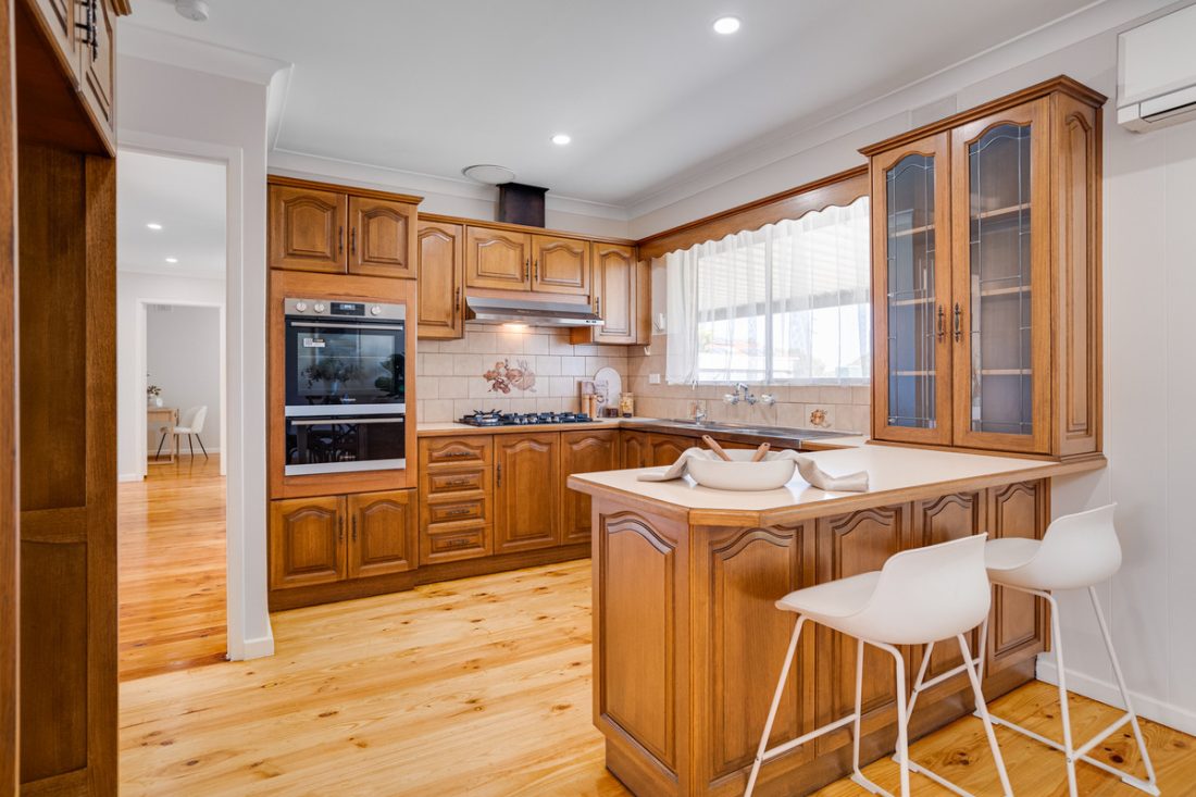 Upon entering, you’ll be welcomed by the expansive living room, an ideal spot for relaxation and unwinding. An elegant archway seamlessly links the living area to the adjoining dining and kitchen areas. The kitchen, with a view of the backyard, features ornate timber cabinetry and modern appliances, including a wall oven and a gas cooktop.