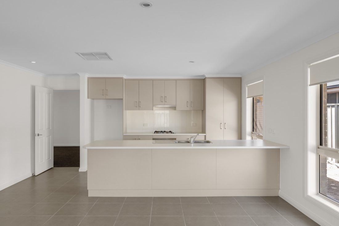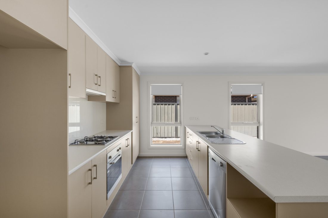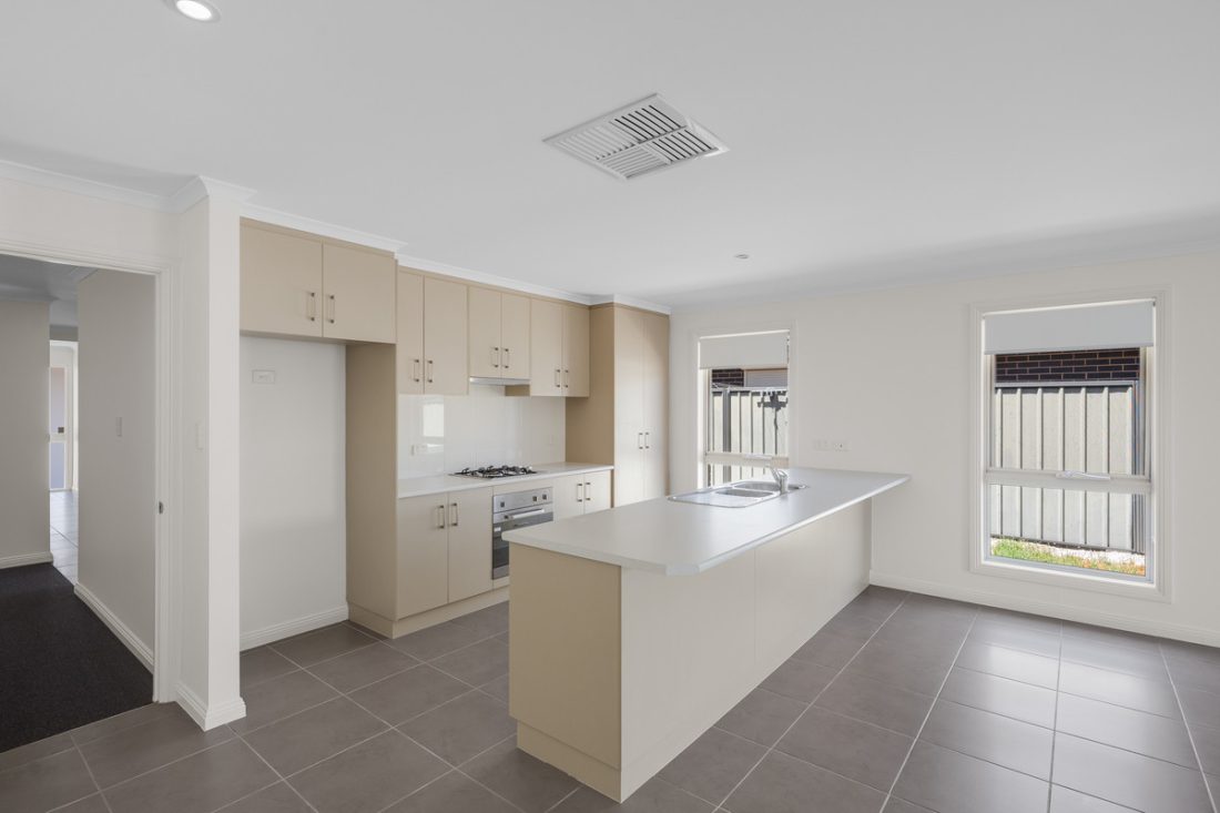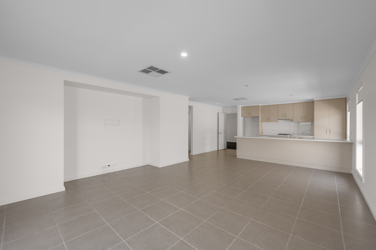 Step inside and follow the hallway into the heart of the home—an open-plan kitchen, living, and dining area designed for both connection and relaxation. The stylish kitchen features warm-toned cabinetry, a tiled backsplash, and sleek stainless steel appliances, including a gas cooktop and dishwasher. The peninsula bench offers the perfect spot to pull up a barstool for casual meals or morning coffee.