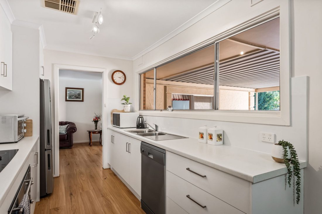Inside, you’ll find two spacious living zones offering flexibility for family life — from movie nights to quiet corners for relaxation. The heart of the home is the beautifully updated kitchen and meals area, where modern cabinetry, sleek stainless steel appliances (including a dishwasher and electric cooktop), and ample storage make daily life a breeze.