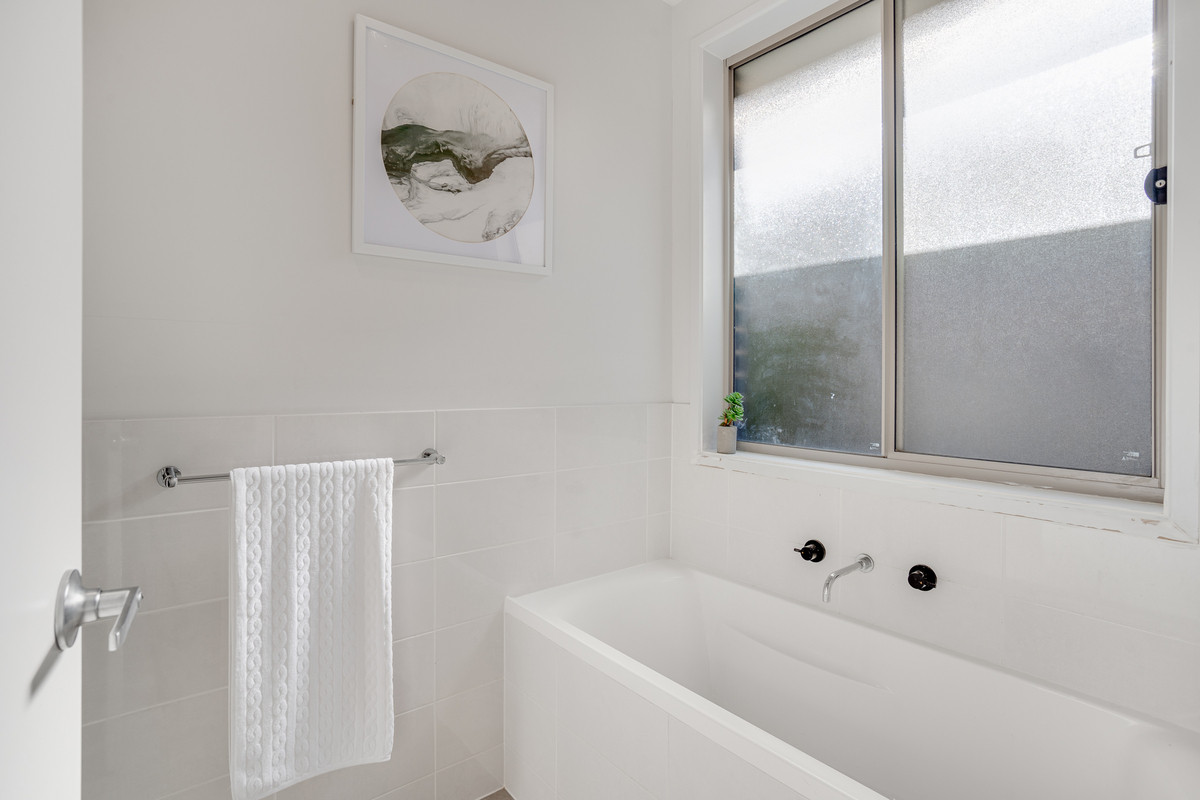 The master suite is a retreat within itself, offering a spacious walk-in robe, a private ensuite, and uninterrupted views of the charming streetscape. Two additional bedrooms, finished with plush carpeting and adorned with wide windows, are complemented by mirrored, built-in robes, providing comfort and convenience for all occupants.