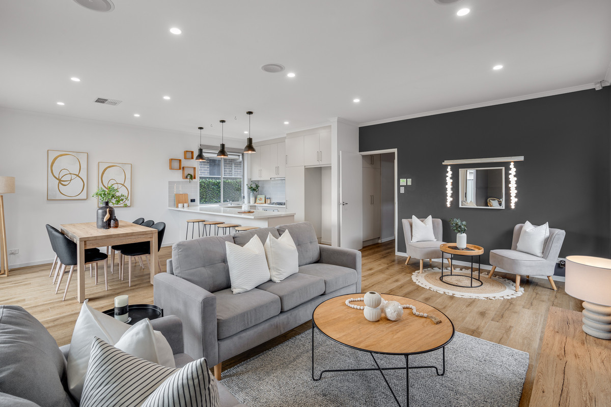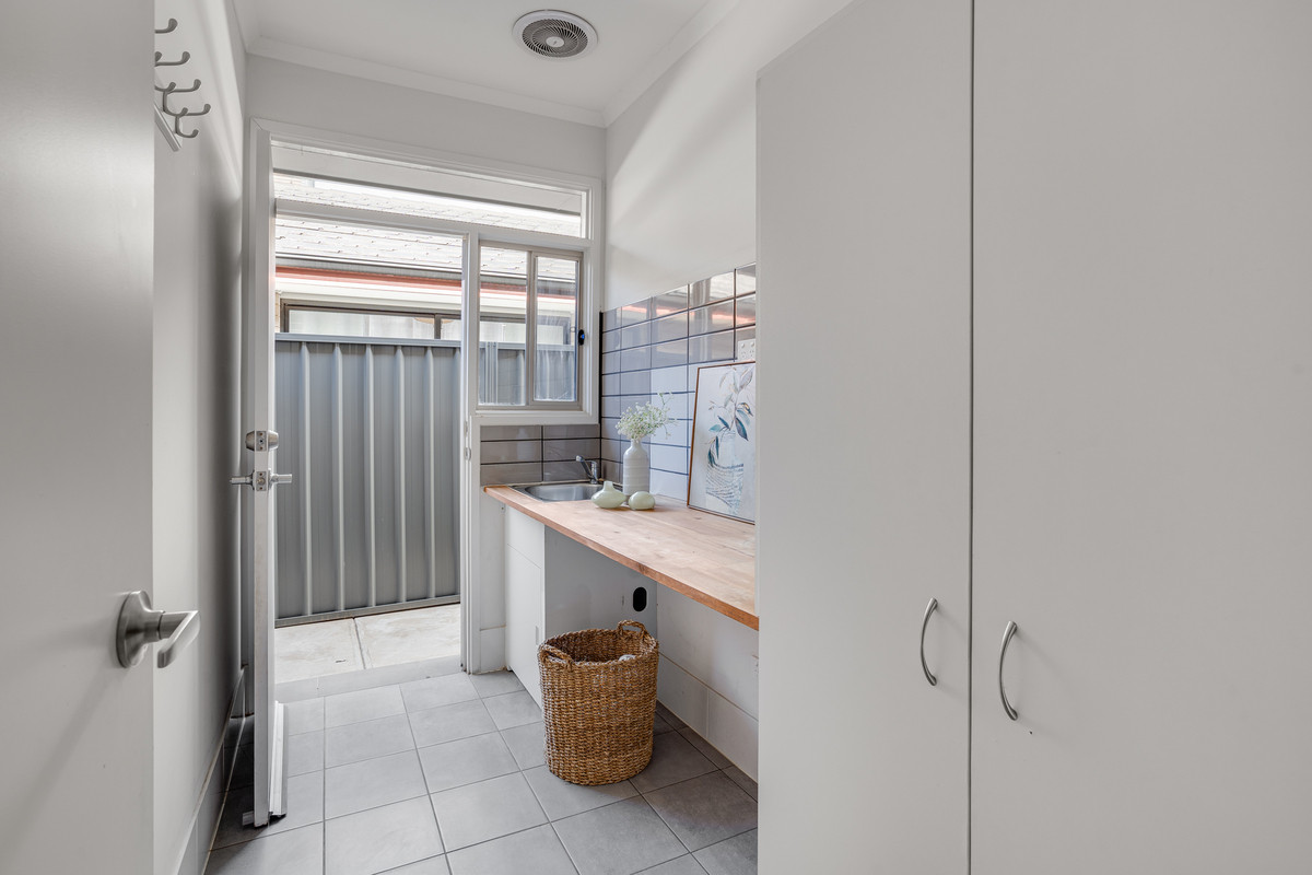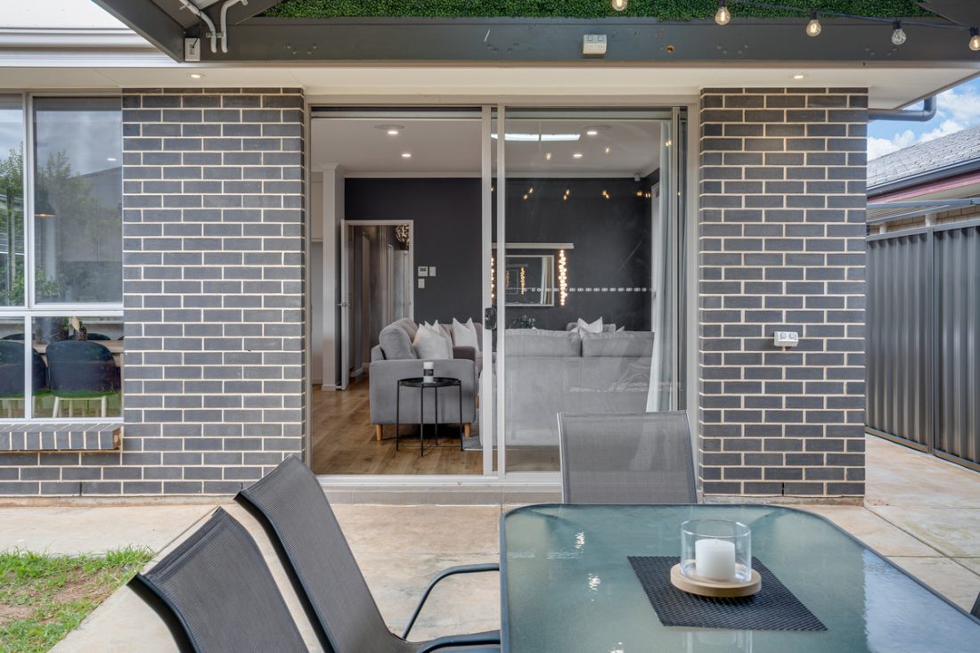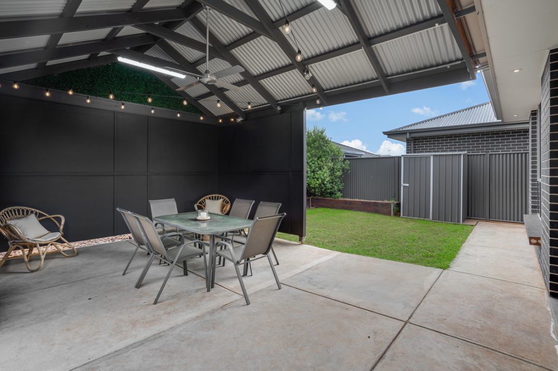 Natural light streams through the living area, illuminating the timber flooring and creating an inviting ambiance. The seamless transition between indoor and outdoor living is facilitated by a glass sliding door, leading to a concreted, undercover area. This inviting space, complete with a ceiling fan, sets the stage for year-round entertaining, allowing family dinners to effortlessly spill outdoors.