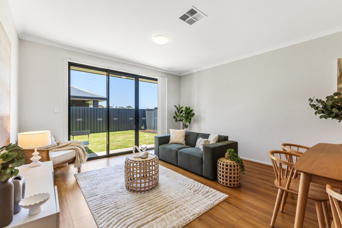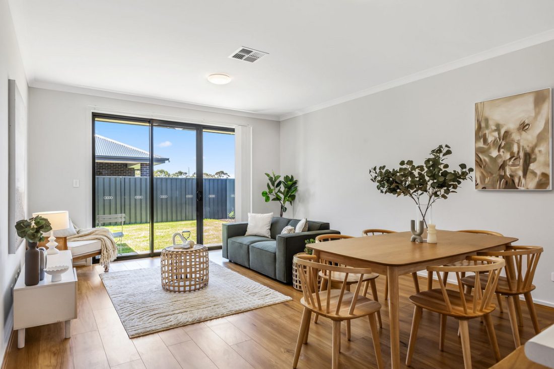 The dining and living areas flow effortlessly together, with natural light streaming through and glass sliding doors connecting to the outdoors. The backyard, complete with a neat lawn, is perfect for entertaining or relaxing in the sunshine.