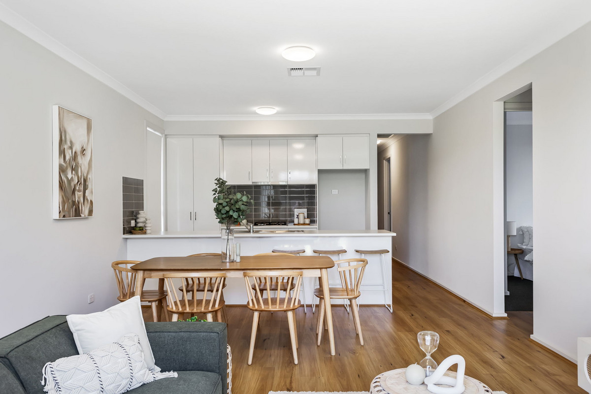 The dining and living areas flow effortlessly together, with natural light streaming through and glass sliding doors connecting to the outdoors. The backyard, complete with a neat lawn, is perfect for entertaining or relaxing in the sunshine.