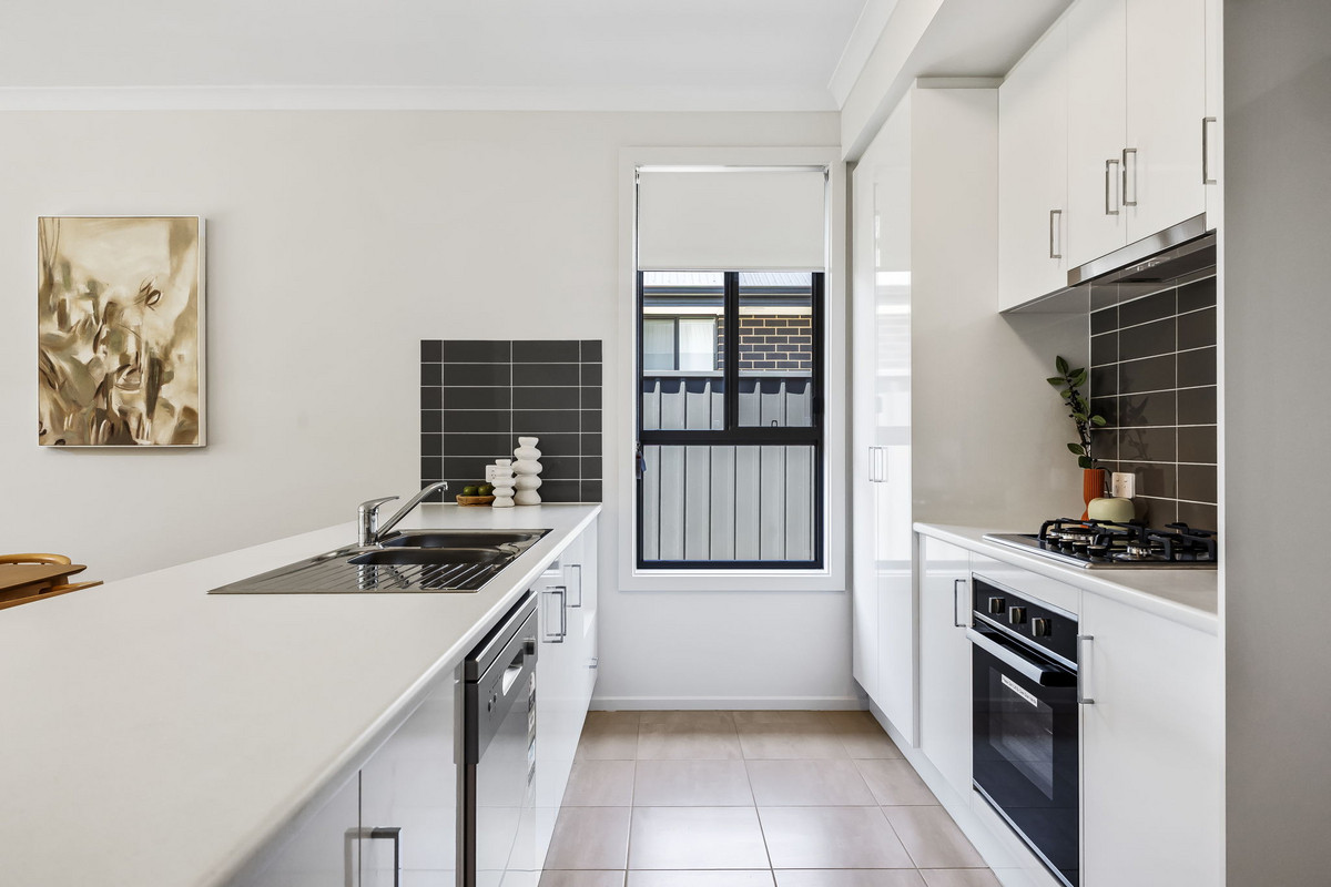 Step inside and be greeted by a hallway that leads to the heart of the home. The open-plan kitchen, living, and dining areas are thoughtfully designed to maximize space and light. The pristine kitchen boasts stainless steel appliances, a gas cooktop, generous counter space, and a chic tiled backsplash, making it as functional as it is stylish.