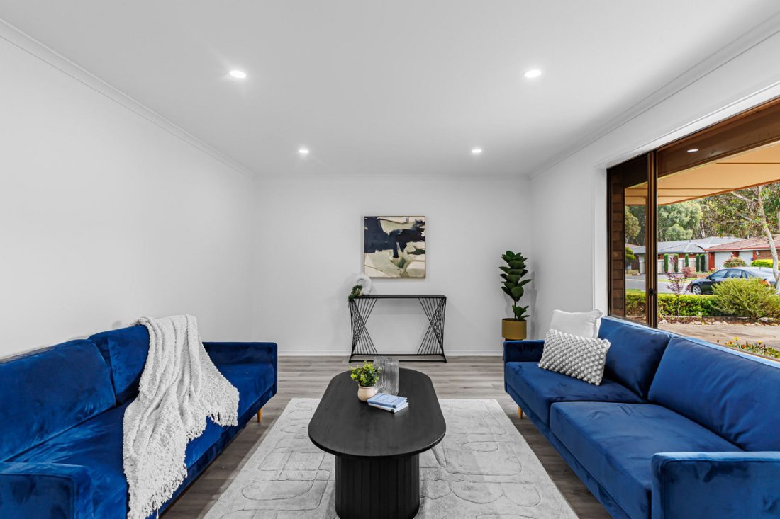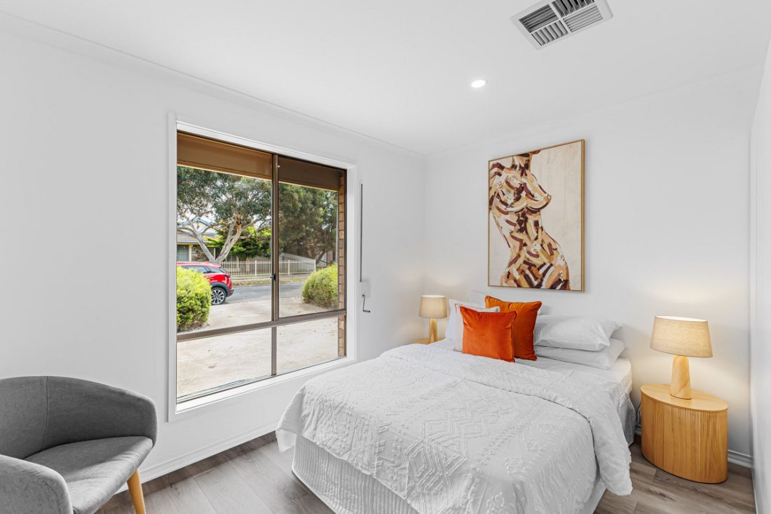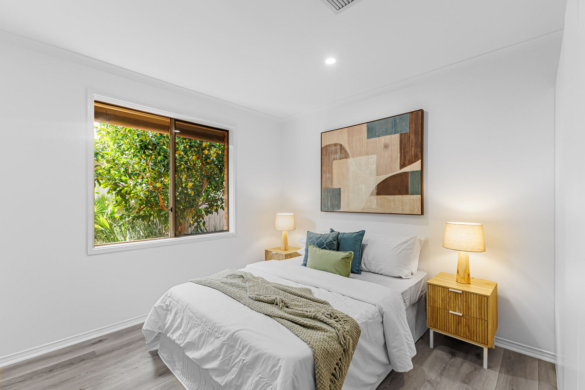 At the front of the home, a cosy lounge room serves as a prime spot for relaxing evenings or unwinding after a busy day. The large window floods the space with natural light and offers a lovely view of the beautifully maintained front garden.