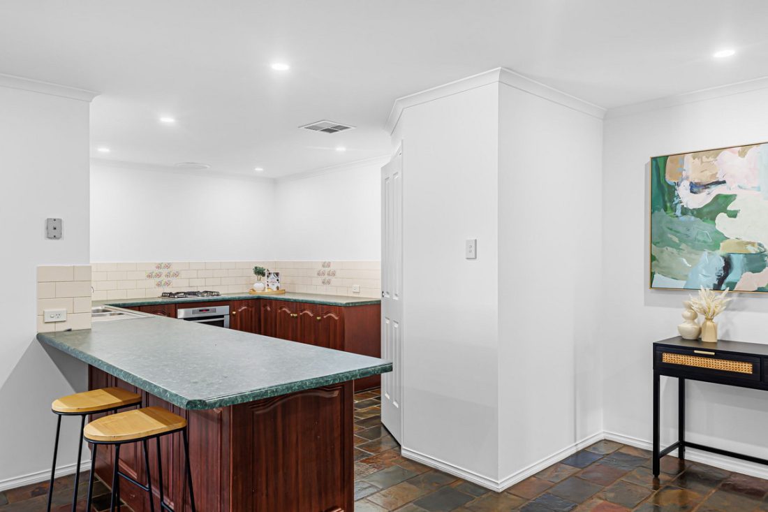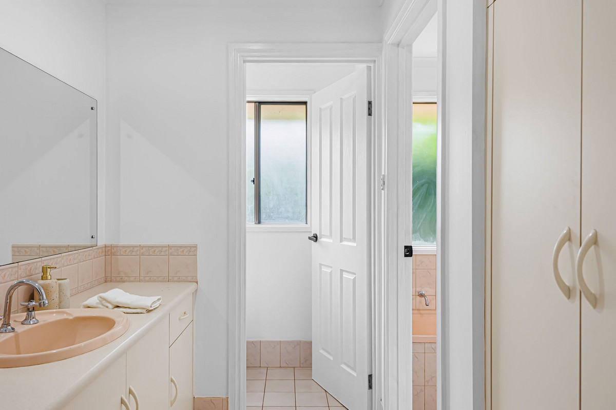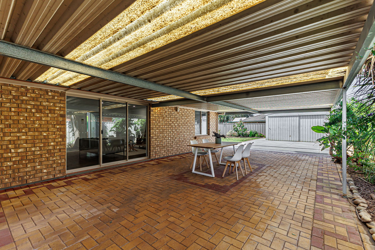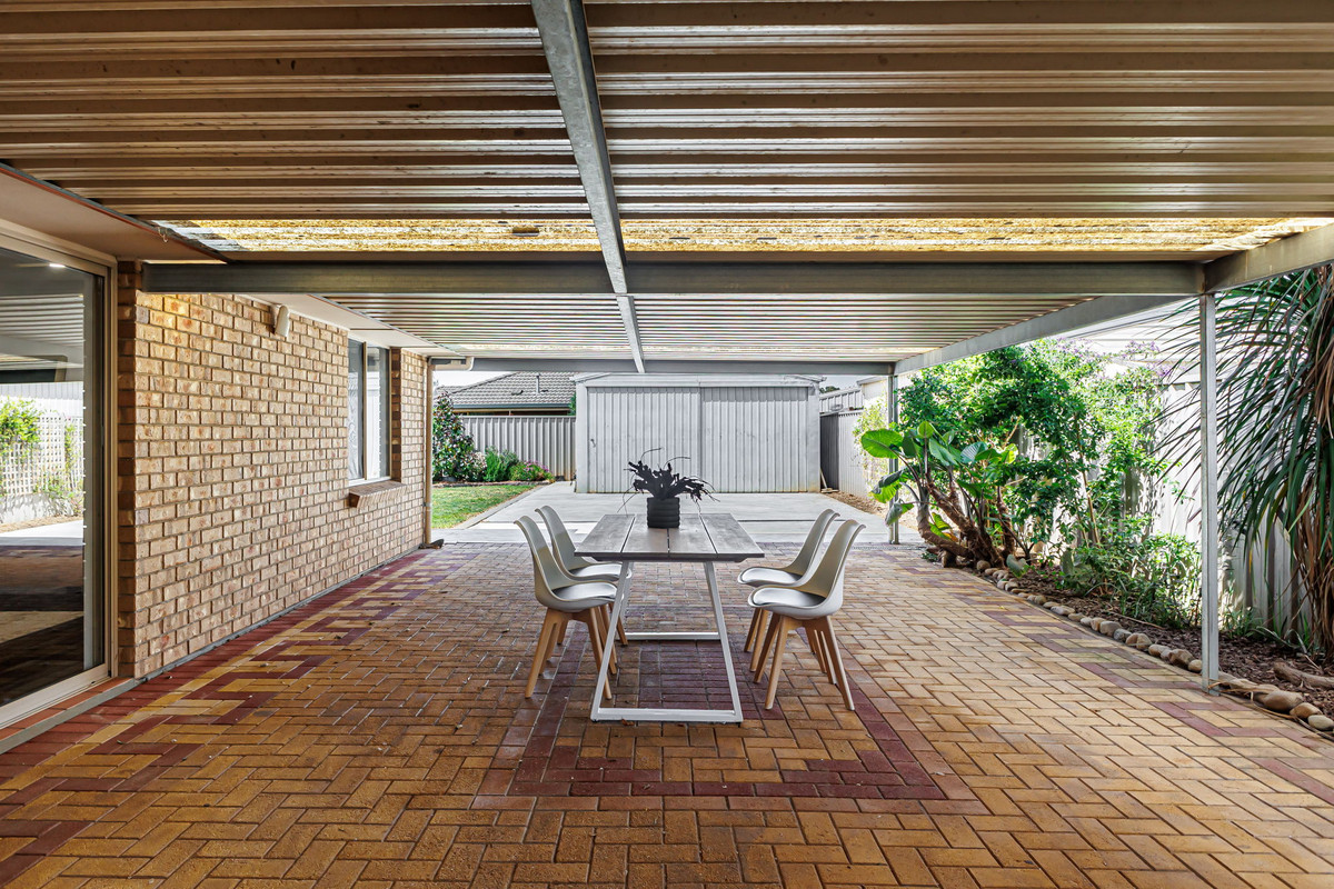 The kitchen overlooks a casual meals area, perfect for daily dining. Double sliding doors open from the living space onto a large verandah, providing a seamless transition between indoor and outdoor living. This generous outdoor space is perfect for year-round entertaining, with plenty of room for family gatherings. A large patch of grass offers the ideal space for kids to play, while a convenient shed provides additional storage.