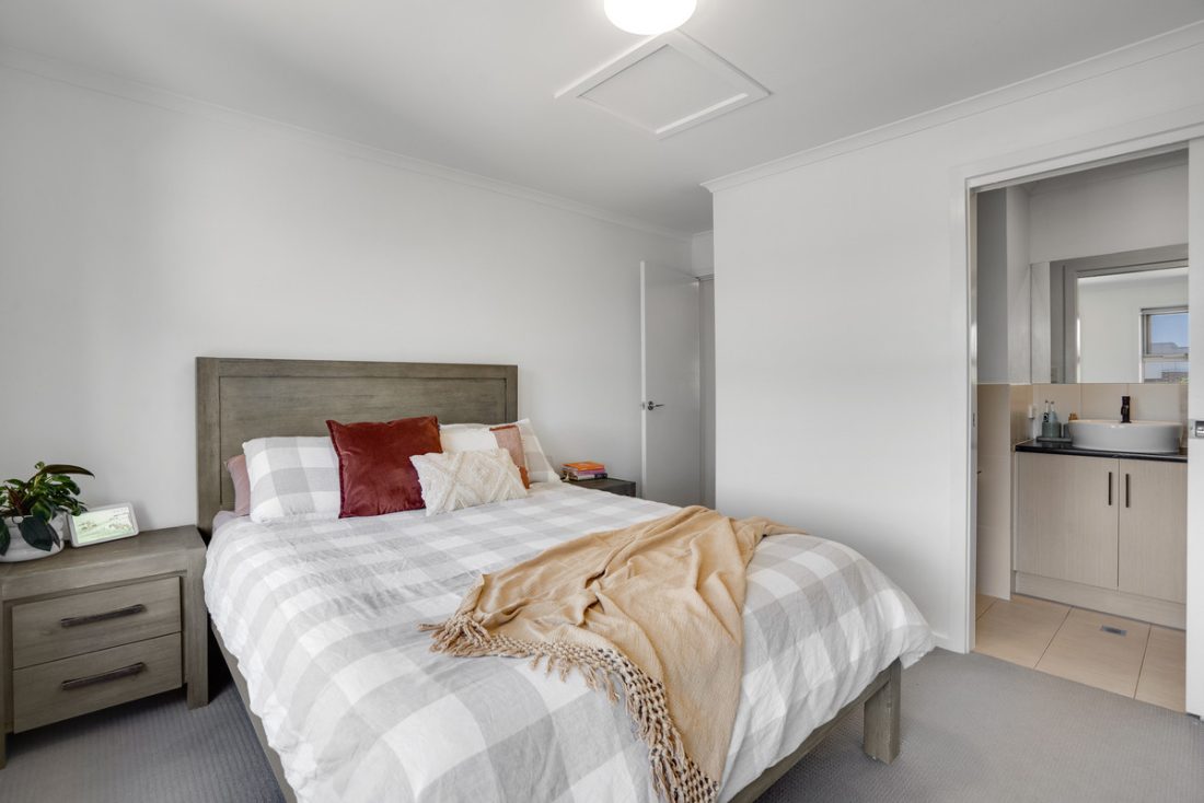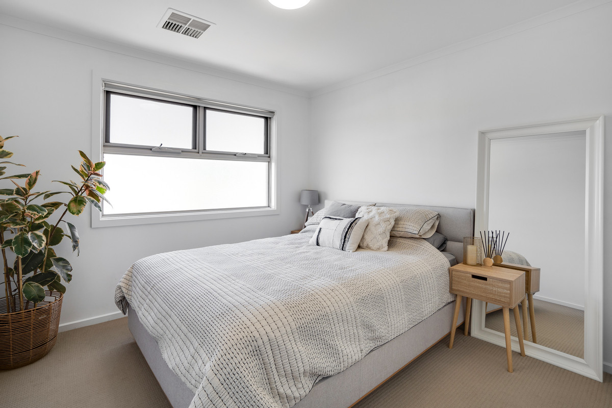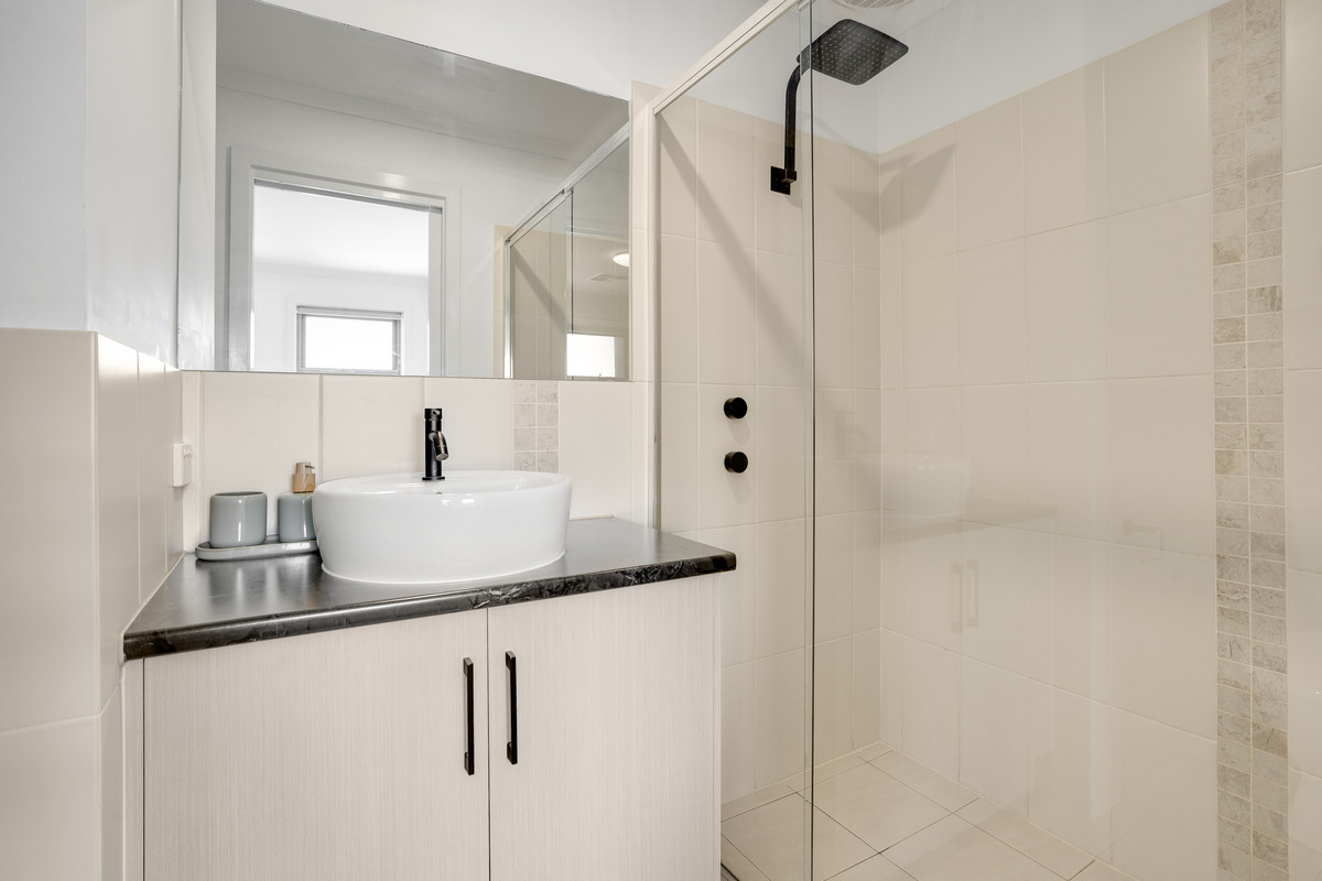The master bedroom is a retreat in itself, offering plush carpeting, a private ensuite, and a large wall to wall, built-in robe. The additional two bedrooms feature built-in robes and wide windows, creating bright and inviting spaces. The main bathroom is modern, showcasing black tapware, contemporary tiling, and a built-in bath.