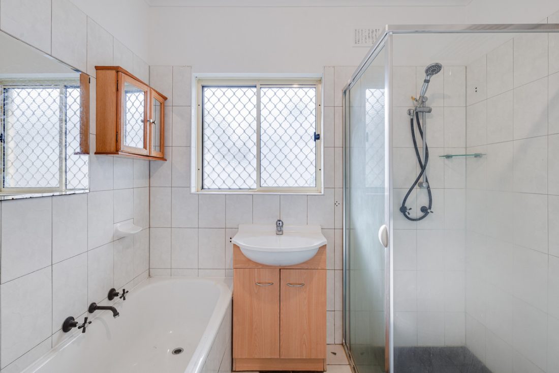 Both bedrooms are generously sized, featuring windows and ceiling fans to ensure comfort throughout the year. The master bedroom comes with a built-in robe, providing ample storage. The main bathroom is well-appointed with a shower, bathtub, vanity, and laundry facilities, ensuring all your needs are met.