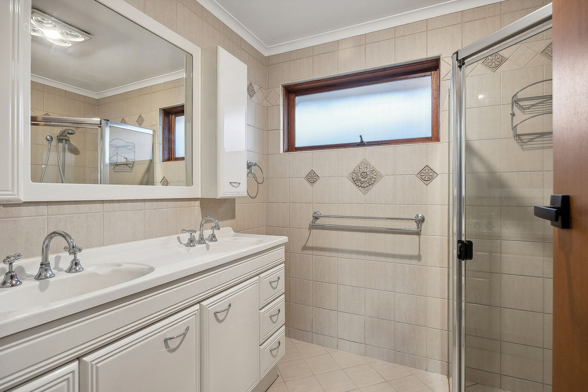 The home’s three well-proportioned bedrooms are all fitted with built-in robes and ceiling fans, offering both comfort and practicality year-round. Located at the front of the home, these bedrooms provide a peaceful retreat away from the main living areas. The bright, modern main bathroom serves all bedrooms and features dual sinks, and a separate toilet for added convenience.