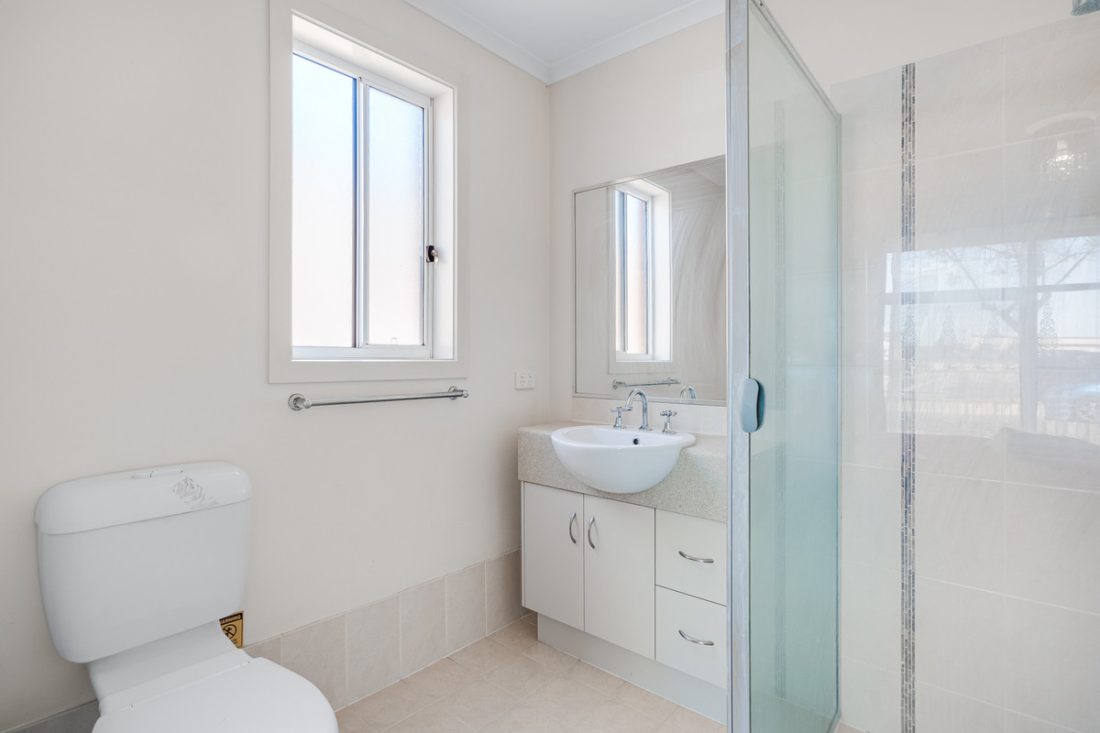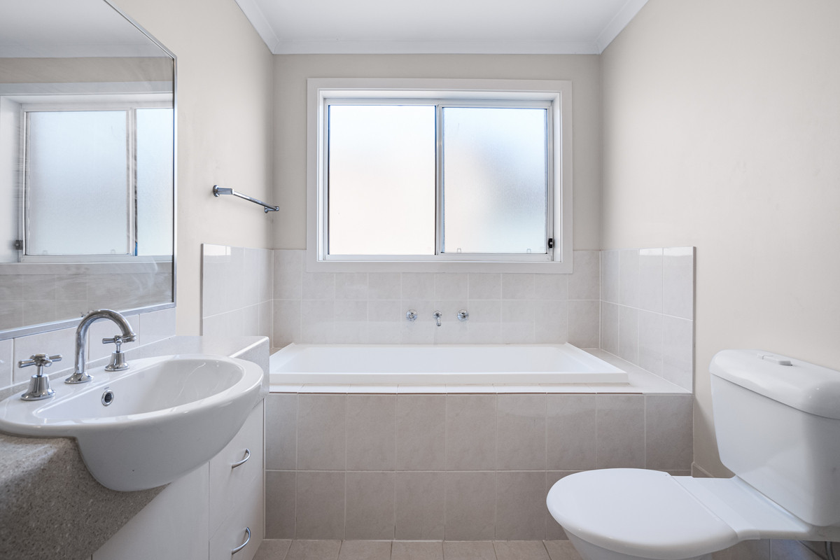 The home offers three generously sized bedrooms, all of which feature plush carpeted flooring and built in robes. The master bedroom is a cut above the rest with an ensuite bathroom which features a shower, toilet, and vanity as well as a walk-in-robe. The main bathroom is stylishly appointed with neutral-coloured tiles and elegant tapware. The space is generously sized and includes a built in bathtub, shower, vanity and toilet.