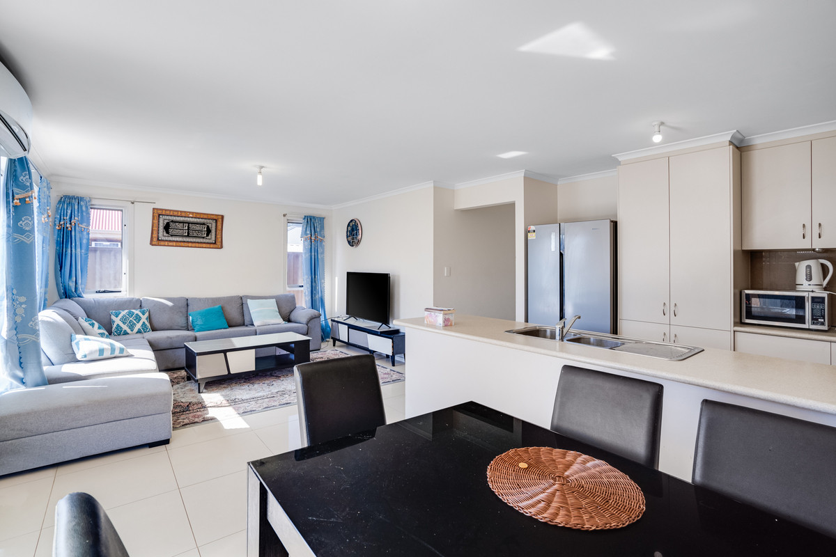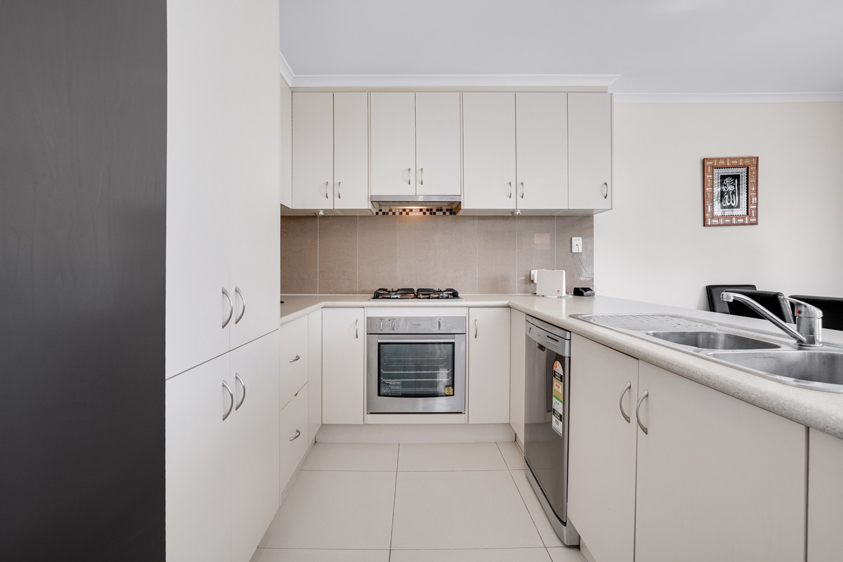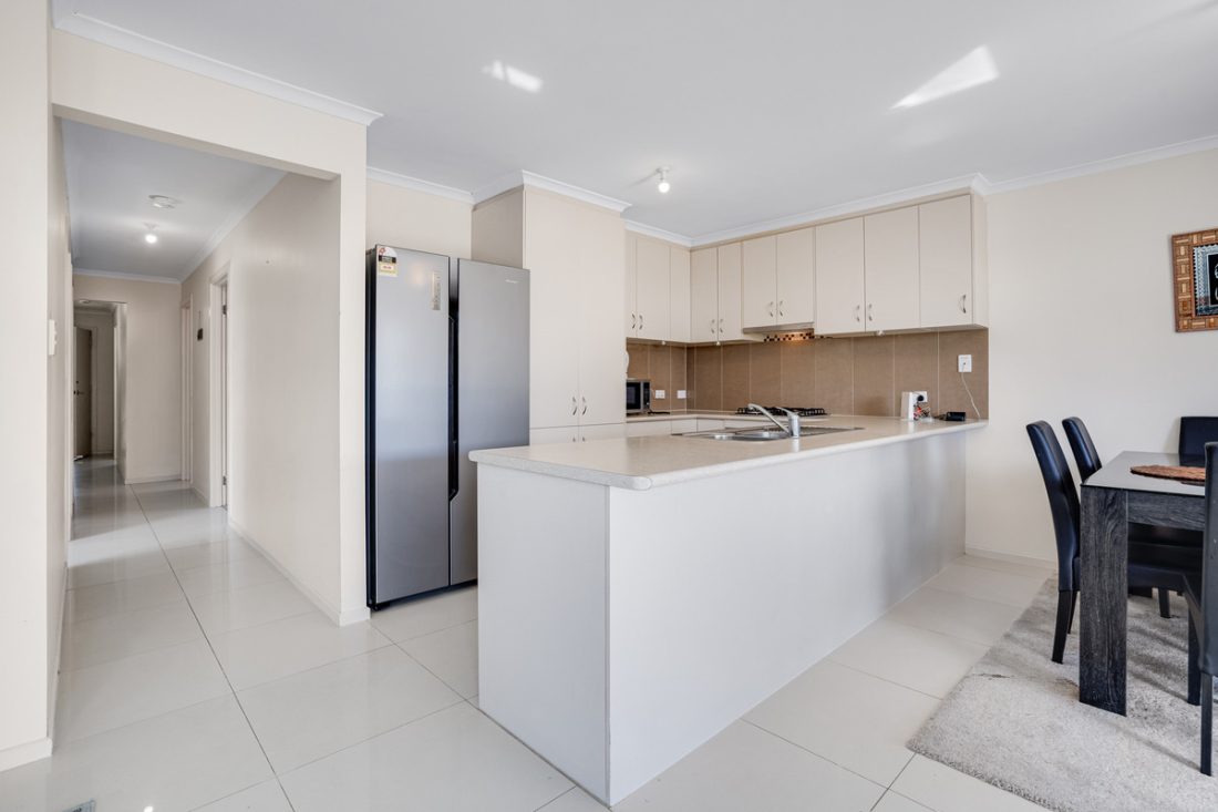 Upon entry, you’ll be welcomed by exquisitely laid tiled flooring that gracefully extends throughout the living areas. Enjoy the pleasures of cooking, relaxing, and dining in the carefully planned open-plan kitchen, living, and dining space, complete with all the necessary features. Indulge your culinary flair in the impeccably designed kitchen, featuring a gas cooktop, oven, dishwasher, and double sink, complemented by an elegant, tiled backsplash and ample cabinetry.