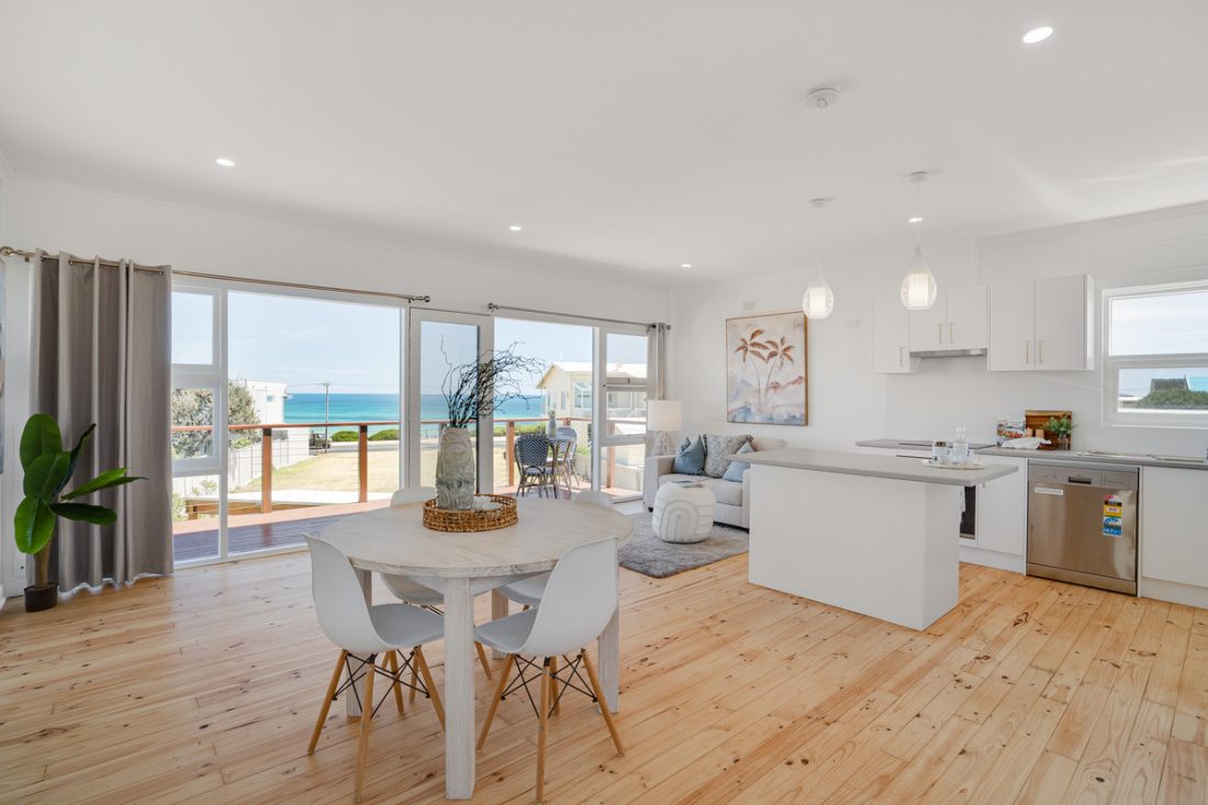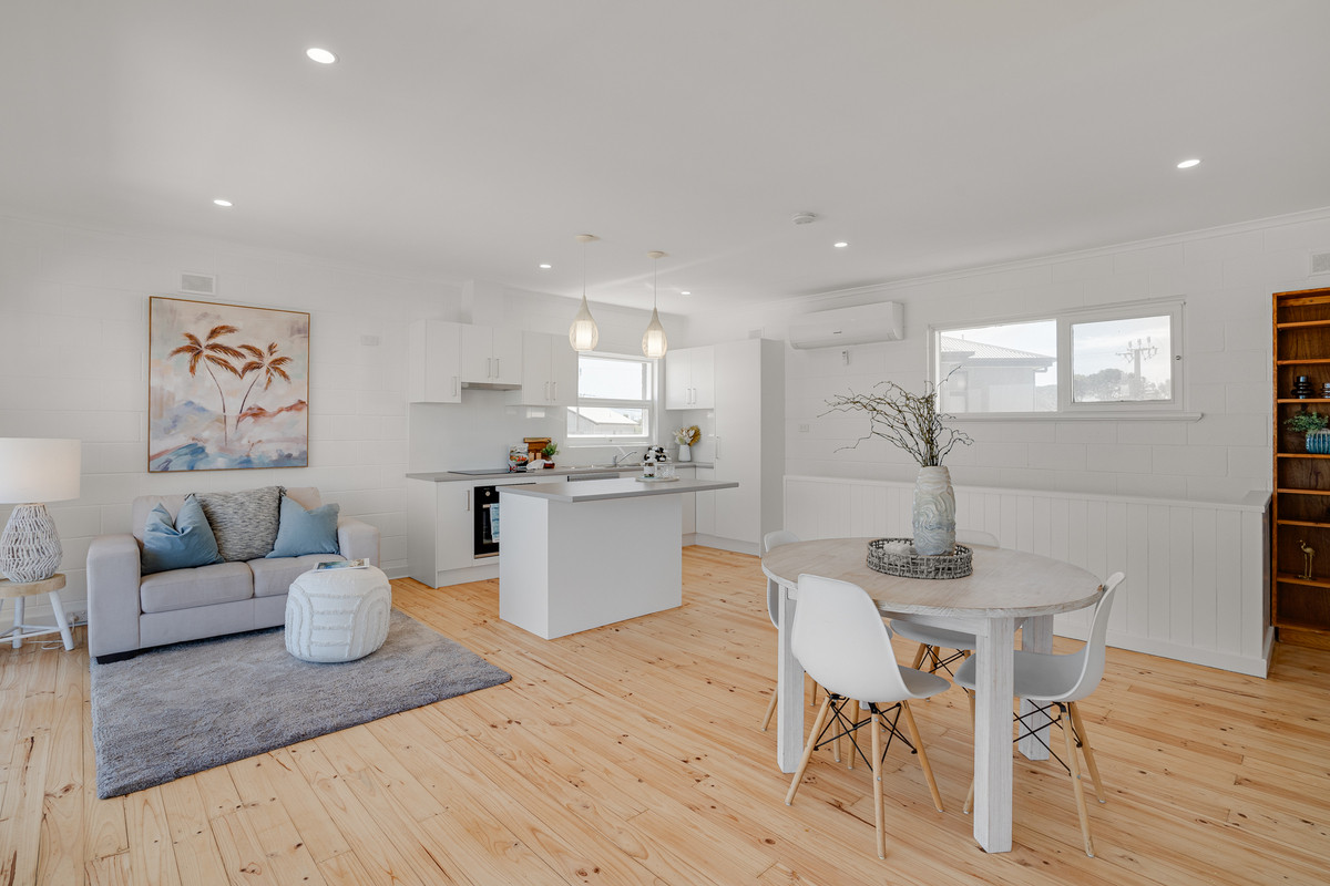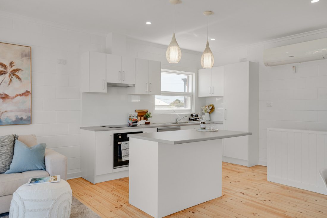 The upper level unfolds into a bright spacious open-plan living area. The brand new modern kitchen offers ample storage and is equipped with a stainless steel Dishwasher and island bench, making meal preparation a breeze. The main living area is generously bathed in natural light, featuring a new reverse cycle air conditioner and radiant polished timber hardwood flooring that exudes warmth and character. It’s the perfect place to unwind after a day at the beach.