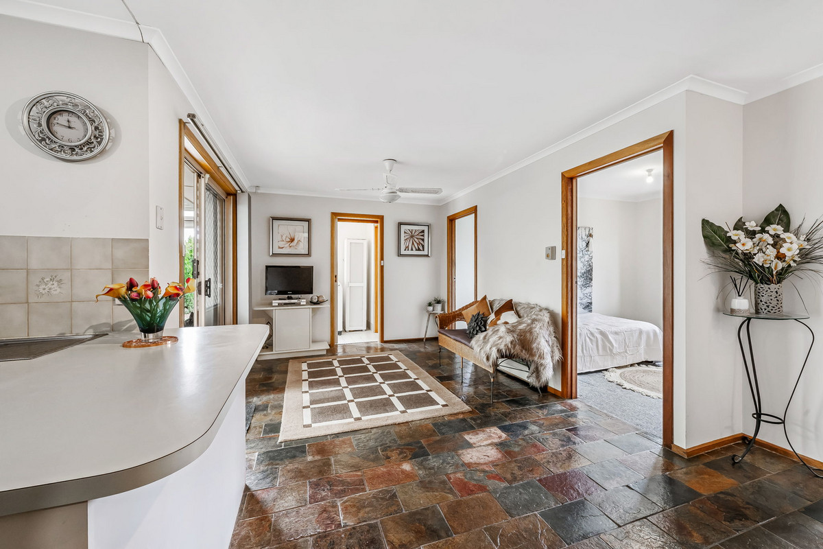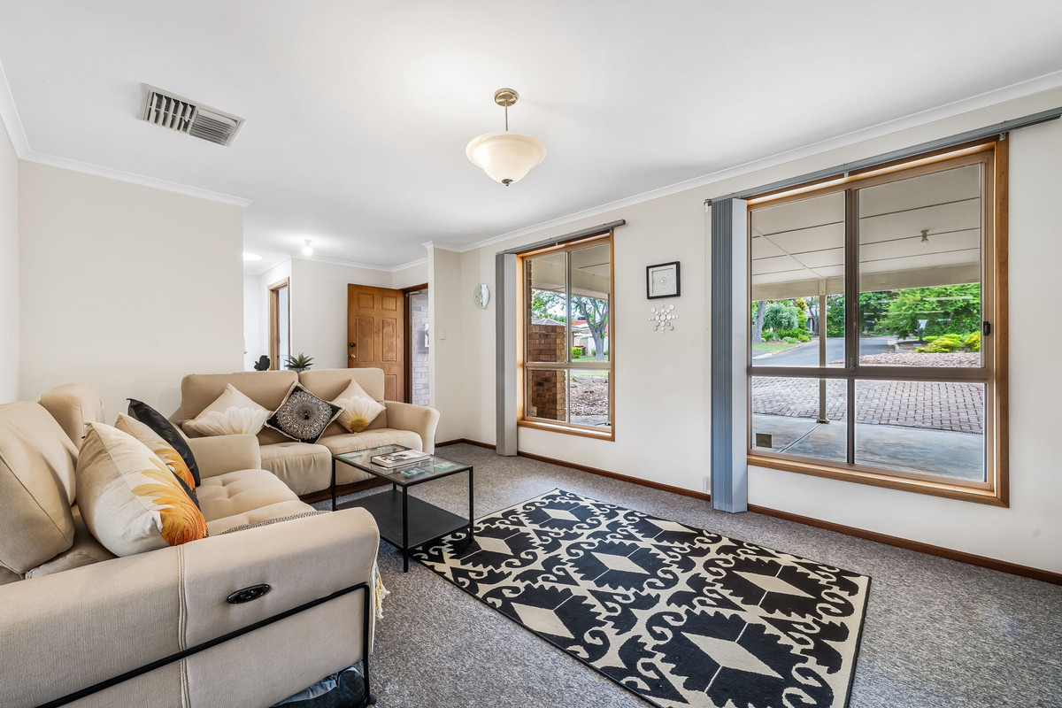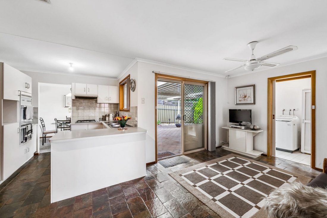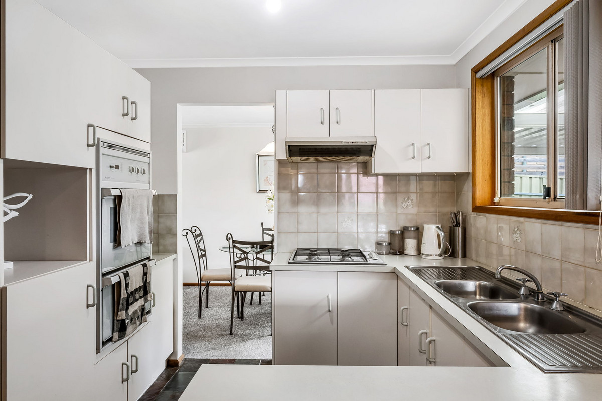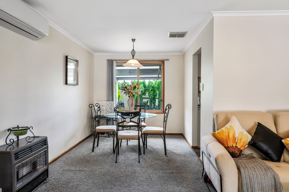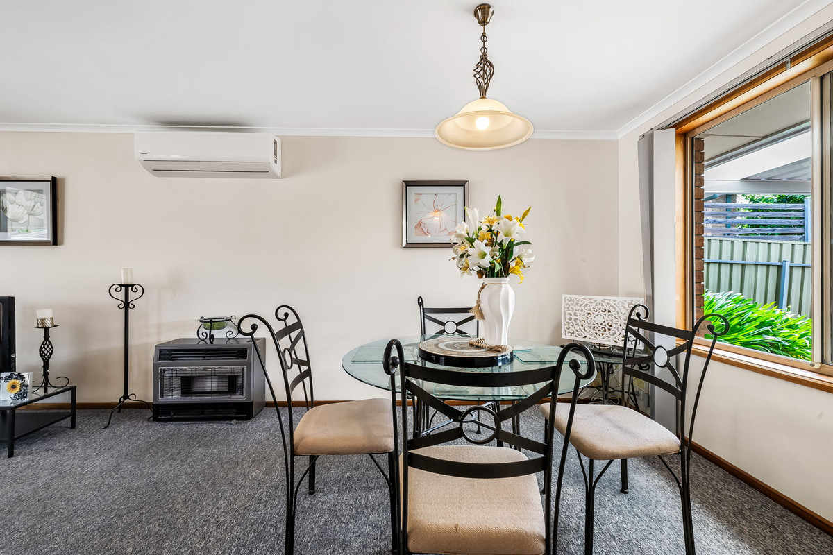 Upon entry, you’re greeted by an L-shaped living and dining area with carpeted floors and a split-system air-conditioner for year-round comfort. Large windows invite natural light to pour in, creating a warm, welcoming space for family gatherings or relaxation.