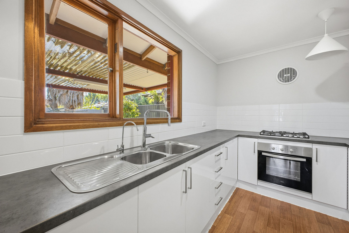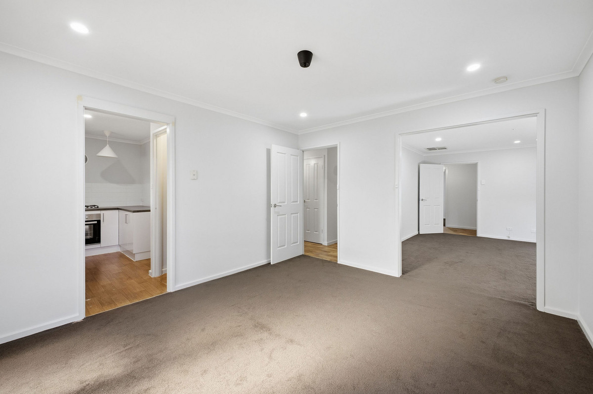 Step through the front door into a bright entry where crisp white walls and an abundance of natural light set the tone. Flowing through to the heart of the home, the kitchen is practical and well-equipped with a double sink, stainless steel appliances, gas cooktop, oven, white tiled splashback and gloss cabinetry finished with stainless steel handles. The adjoining dining area feels cosy with carpet underfoot and connects seamlessly through to the spacious living room, which also offers access from the front entry hallway for added functionality.