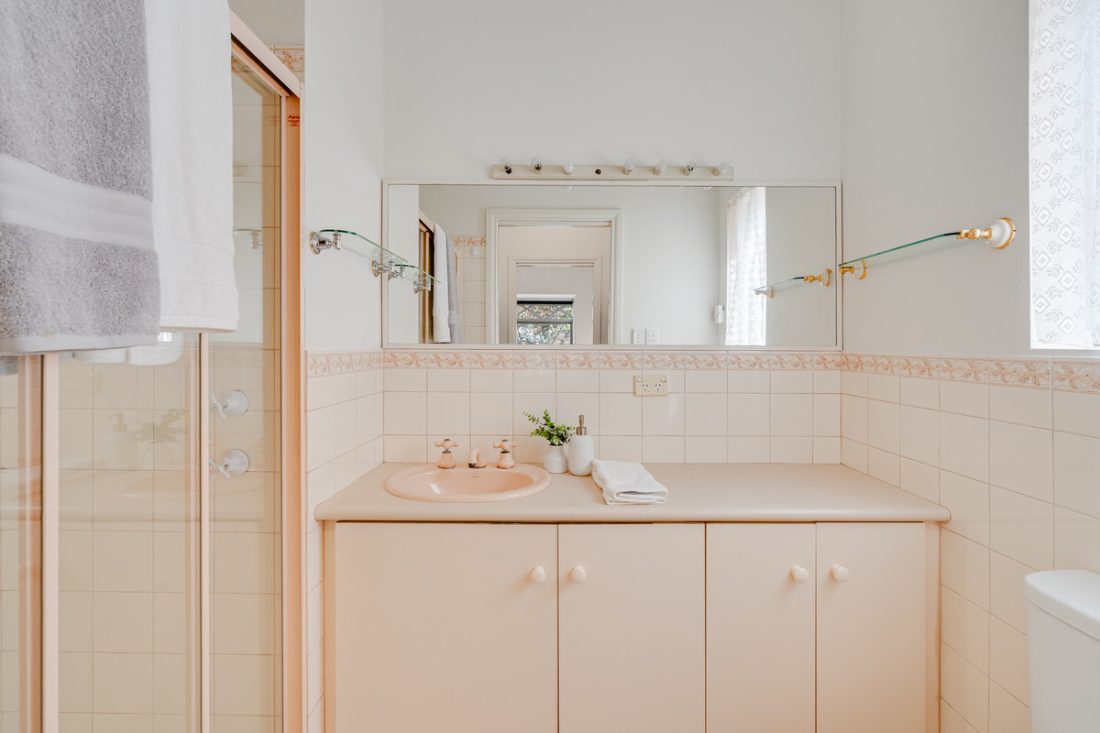 Both bathrooms offer half-tiled walls and ample storage, with the main bathroom boasting a convenient three-way layout, including a separate water closet for added practicality.
