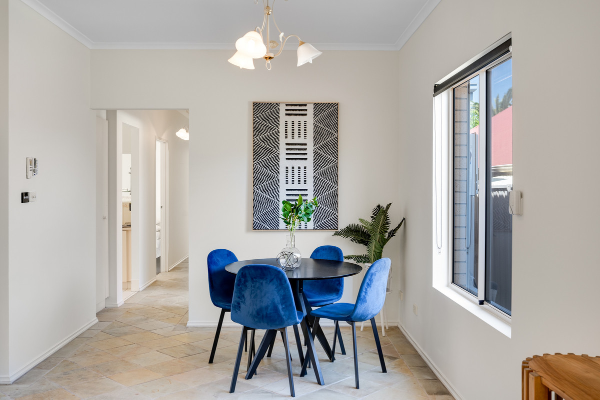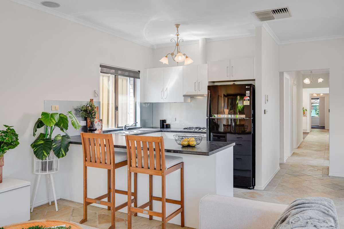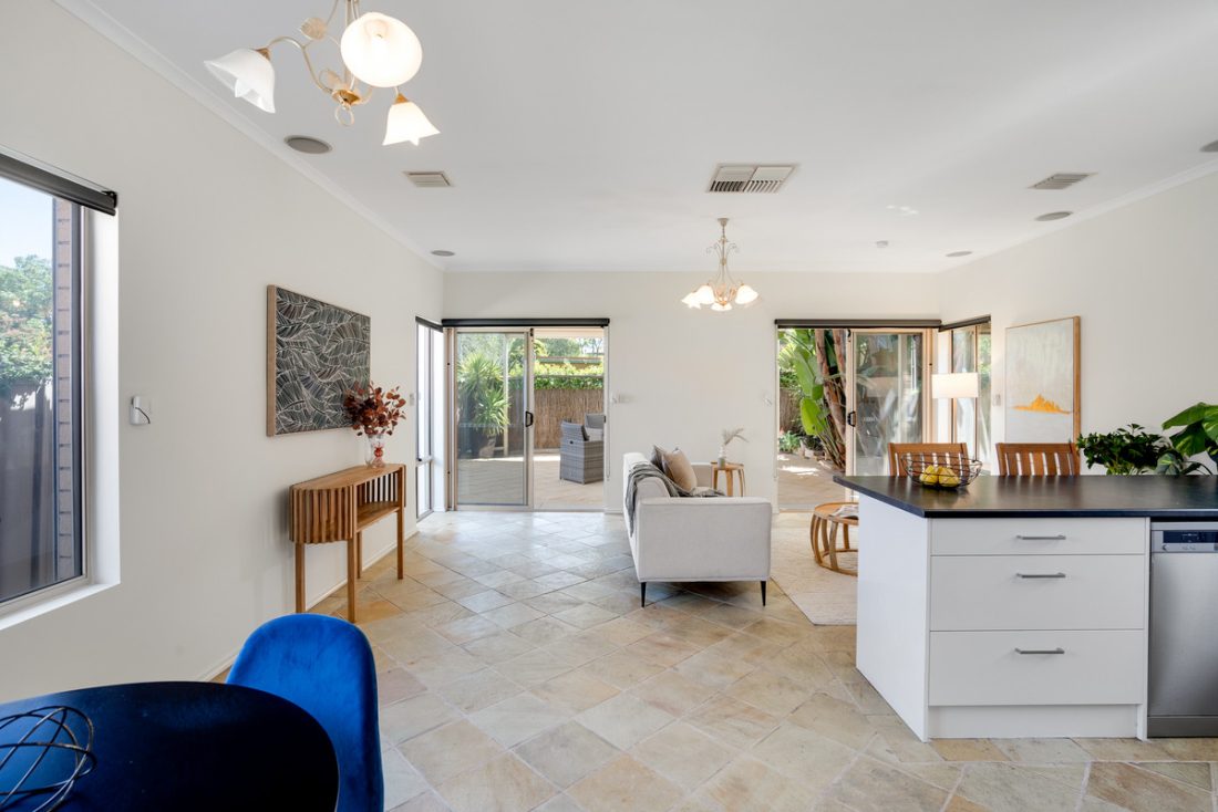 Step inside and follow the hallway to the heart of the home, where the lounge, dining, and kitchen seamlessly blend into an inviting open space. Two sets of glass sliding doors offer leafy views of the rear yard, bringing in a calming, zen-like atmosphere.
