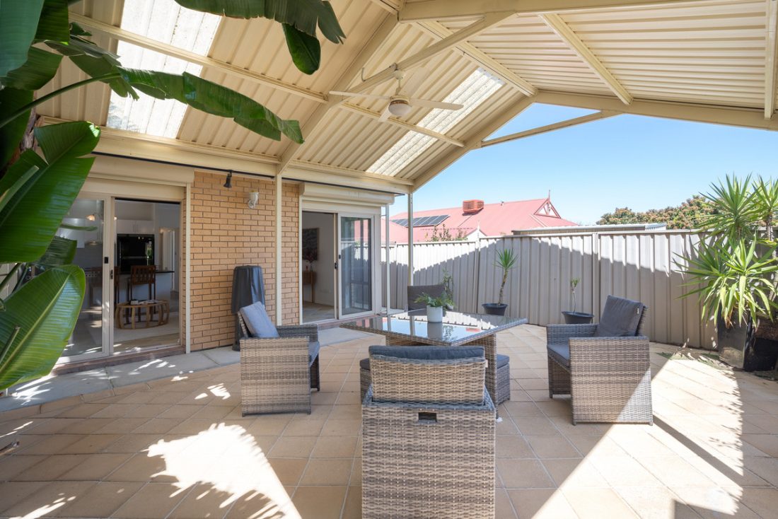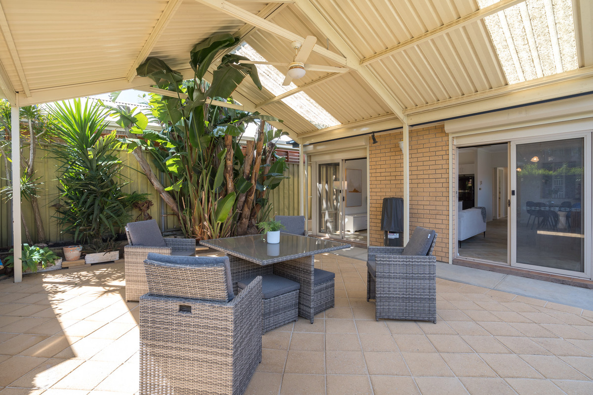 Open the sliding doors to discover a delightful undercover outdoor space, featuring a pitched pergola, ceiling fan, and garden beds filled with established greenery. This low-maintenance area is perfect for entertaining family and friends year-round.