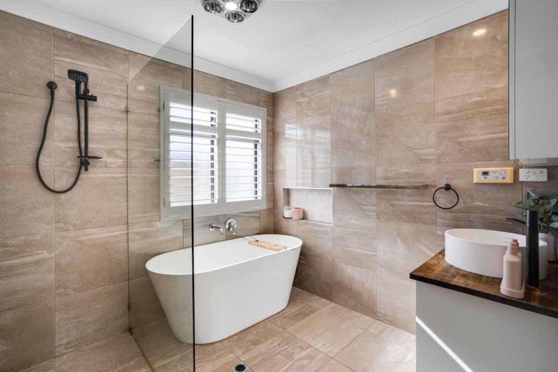 – Sophisticated main bathroom with floor-to-ceiling tiling and a freestanding bath