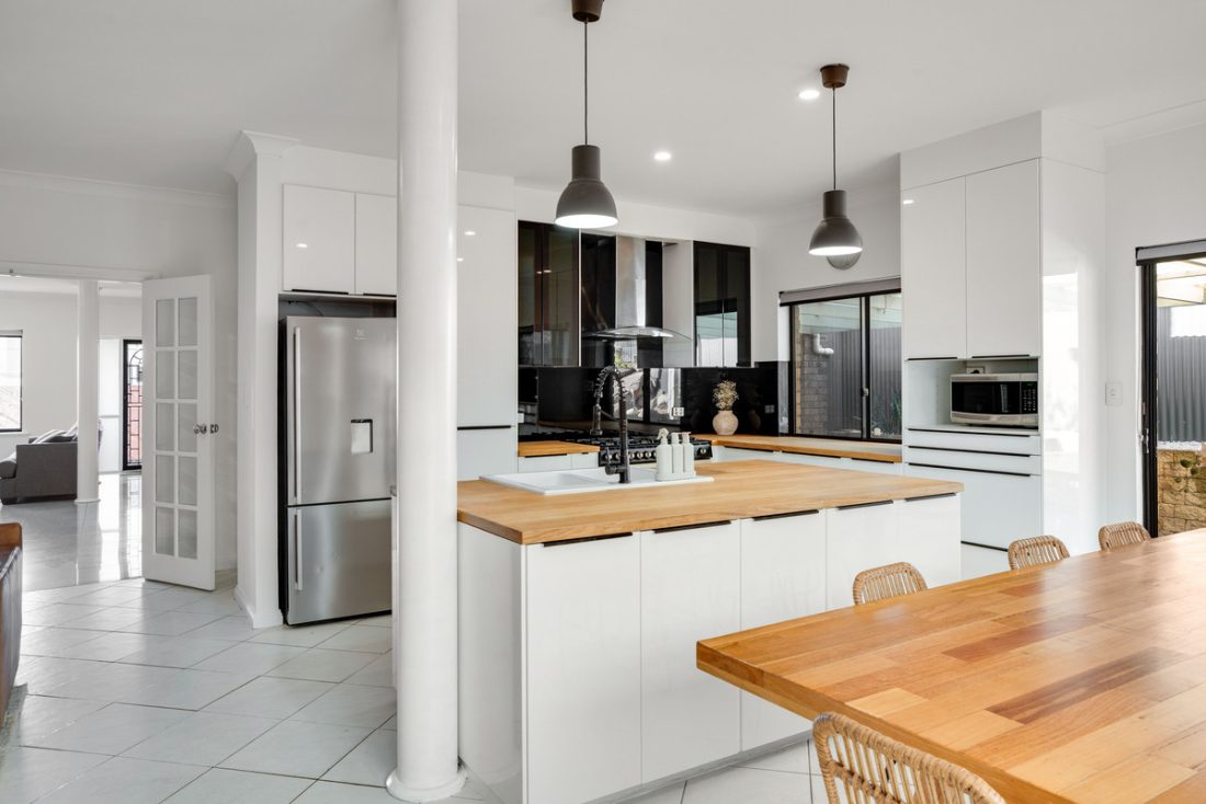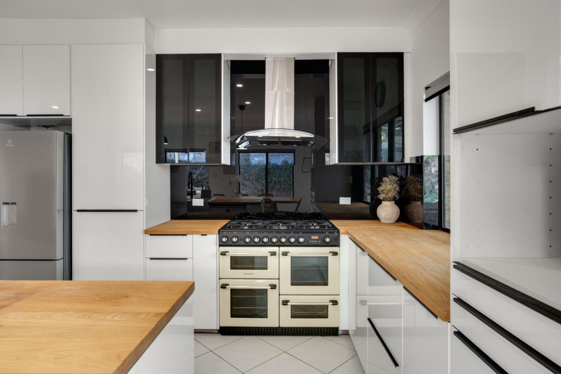 – Stylish kitchen featuring neutral white cabinetry, warm timber benchtops, ample storage, and a statement 1200mm freestanding oven and cooktop