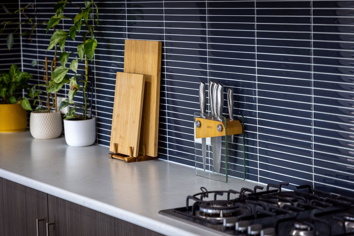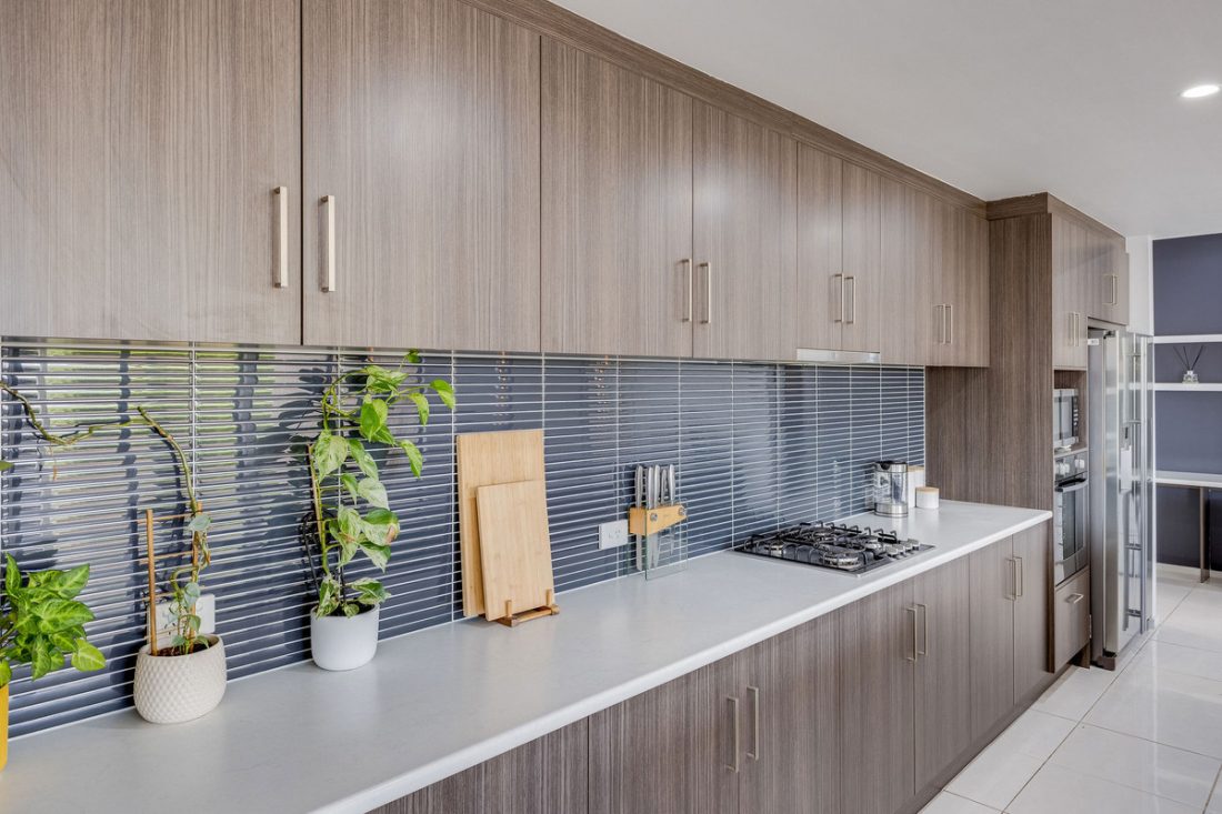 – Kitchen features sleek cabinetry, walk-in pantry, striking tiled backsplash and stainless steel appliances including a gas cooktop