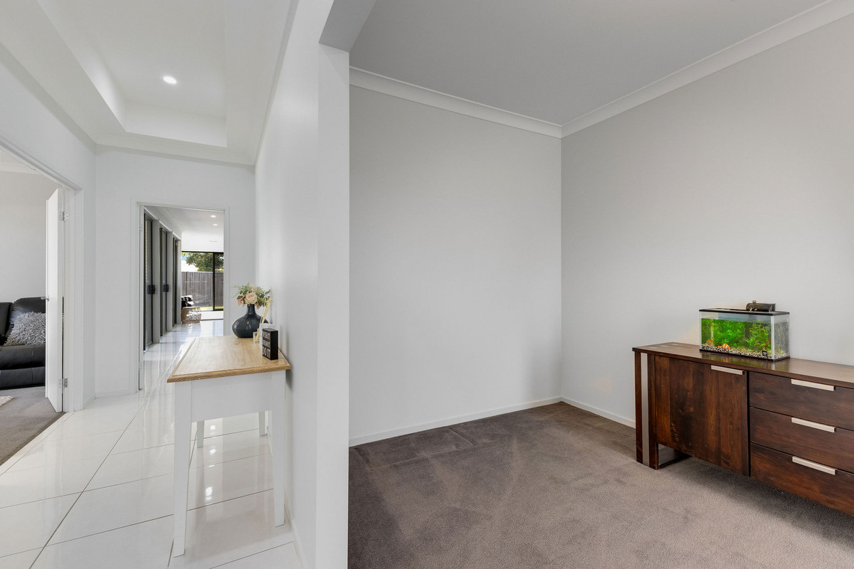 A secondary living area at the entrance offers versatility, making it the perfect space for a formal lounge, fifth bedroom, gym, or whatever you’d like. A separate study offers the perfect spot for those studying or working from home.