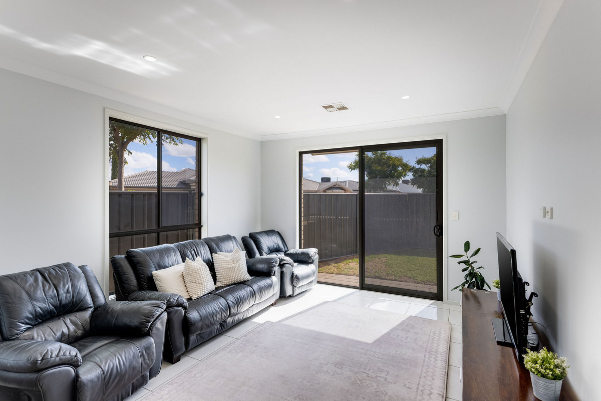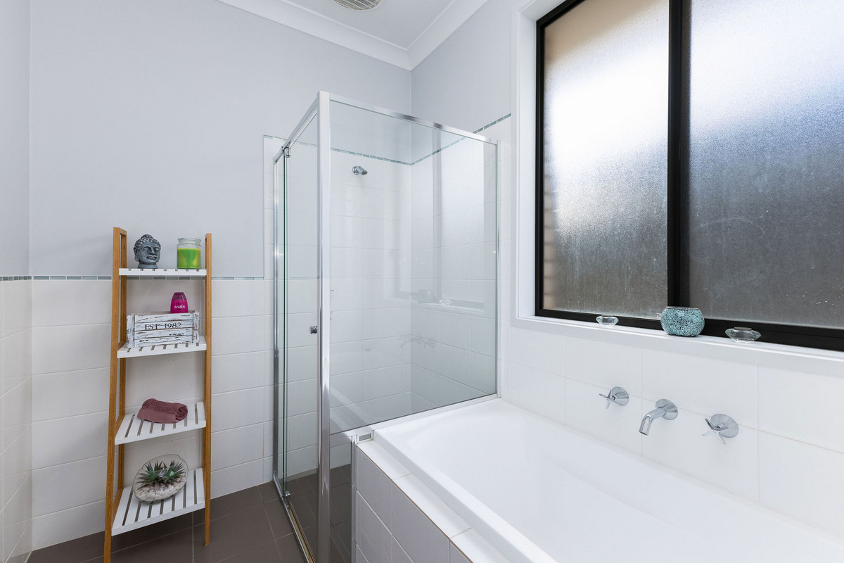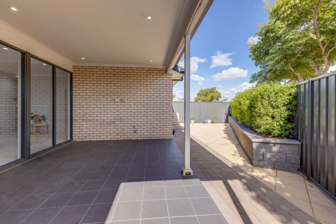 Glass sliding doors effortlessly merge indoors with outdoors, where an undercover alfresco area complete with floor tiles and down-lights delivers the perfect space for hosting guests, framed by lush hedging for an added sense of seclusion. A neat patch of lawn provides just the right amount of space for kids to play and pets to roam.